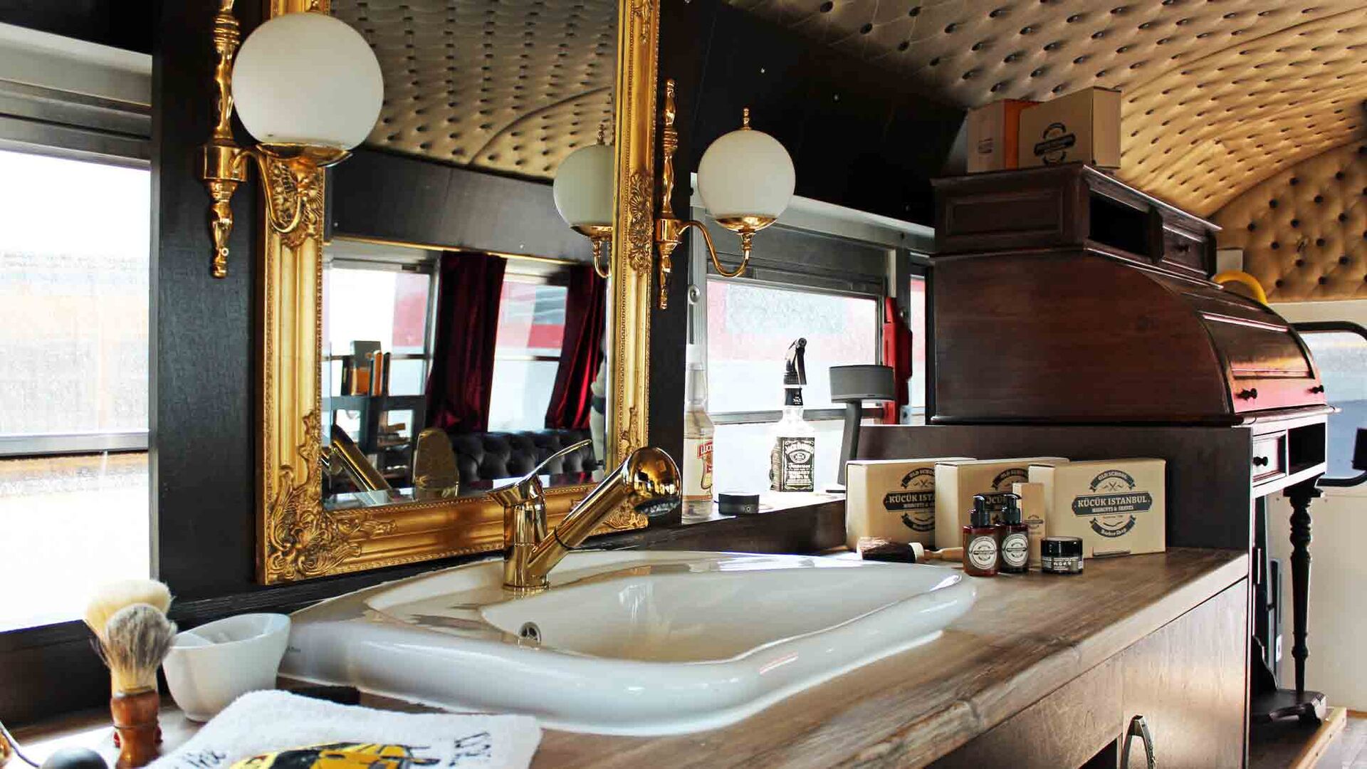 Bis ins kleinste Detail ist der Innenraum des Barber-Trucks durchdesignt: Edle Deko-Elemente perfektionieren das Look & Feel. Dazu gehören rote Samtvorhänge, massive gläserne Aschenbecher und durchdesignte Barber-Produkte.