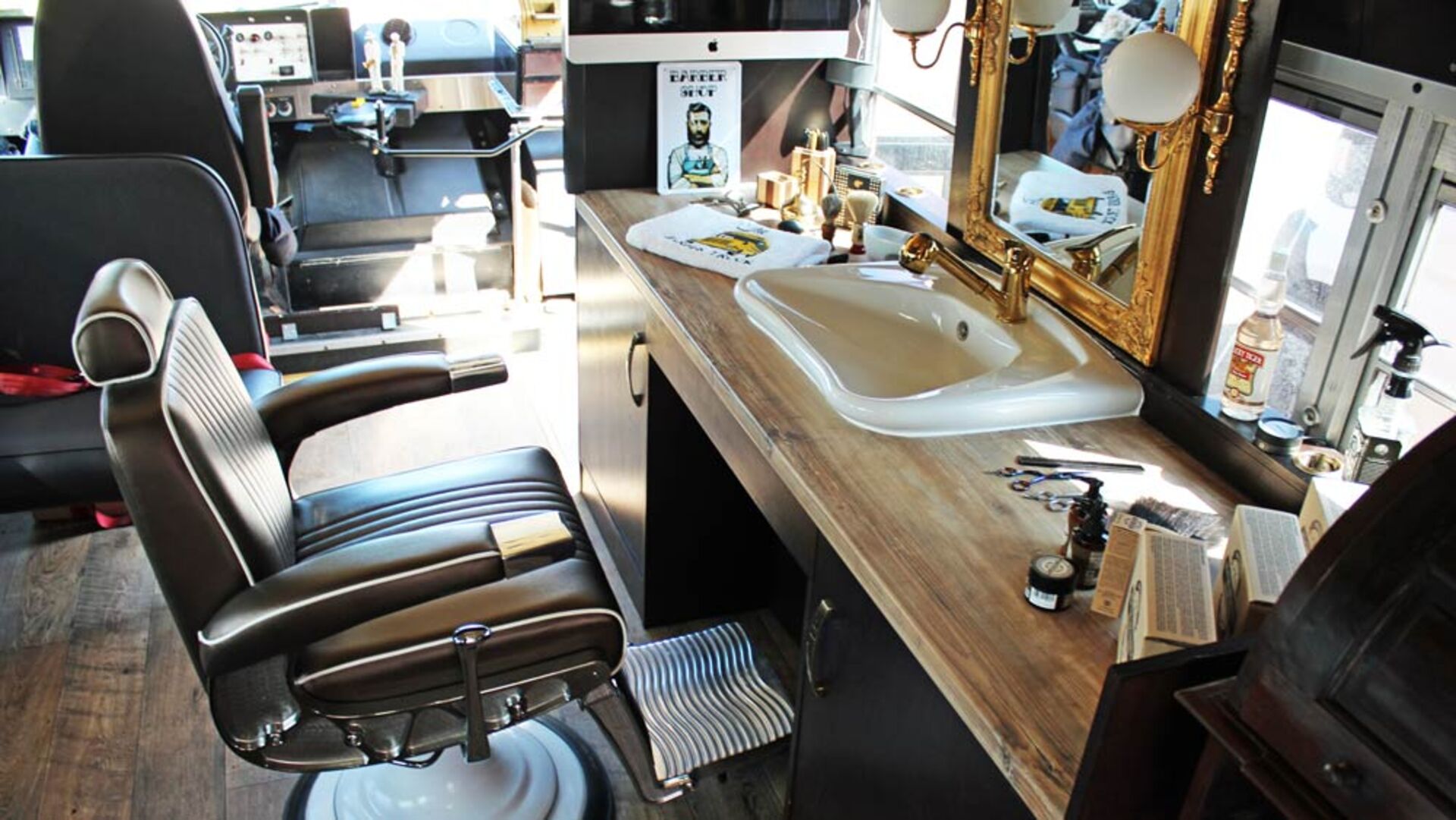 So findet sich inmitten des Busses eine große Arbeitsfläche mit integriertem Waschbecken inklusive goldenem Wasserhahn. Davor kann der Kunde auf dem Friseurstuhl im Vintage-Look Platz nehmen. Für Zigarren-Fans und wartende Kunden bietet sich die Chesterfield-Lounge inklusive Zigarren-Auswahl zum Abschalten an - Dandy Feeling pur. Das alles auf einer Länge von 7,30m sowie einer Breite und Höhe von 2,60m.