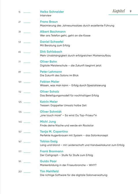 Weitere 15 herausragende Köpfe der deutschen Friseurbranche (Franc Braun, Albert Bachmann, Daniel Schwefel, Dirk Schlobach, Oliver Bohn, Peter Lehmann, Fabian Maier, Oliver Scholz, Katrin Meier, Oliver Schmidt, Michi Jung, Tanja M. Copertino, Tobias Essig, Frank Brormann und Guido Paar) teilen nun in diesem Buch ihre Erfolgsrezepte, Businessmodelle und Gedanken zur Branche mit der Branche. Und das nicht nur in Textform! Jeder, der das Buch kauft, bekommt Zugriff auf alle Videointerviews der Mit-Autoren!