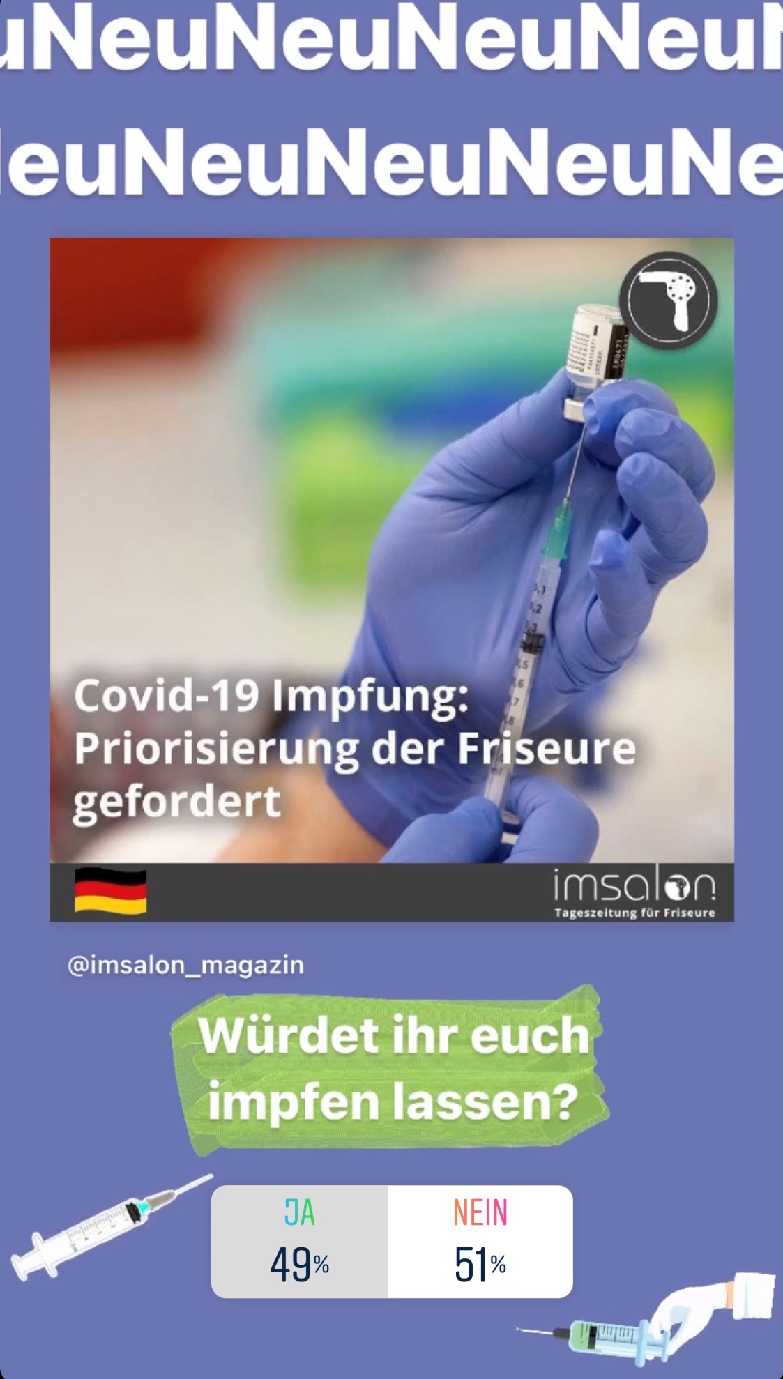 580 FriseurInnen gaben ihre Stimme in unserer INSTA-Kurzumfrage "Würdet ihr euch impfen lassen?"
