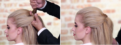 Step 3| Das Passé von der gegenüberliegenden Seite des Pferdeschwanzes mit zwei Fingern greifen und das Passé der anderen Seite mittig durch den Zopf geben, mit den Fingern von untern greifen und straff durchziehen. Mit einer Haarnadel fixieren.