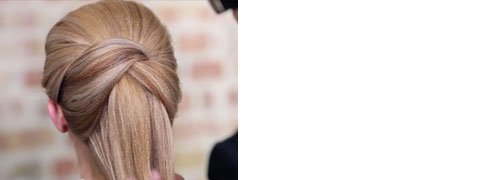 Step 2| Hinter Ohrläppchen beginnend ein diagonales Haarpassé mit den Finger in Richtung Pferdeschwanz nehmen. Dieses Passé schräg an der Oberseite des Pferdeschwanz kreuzen.