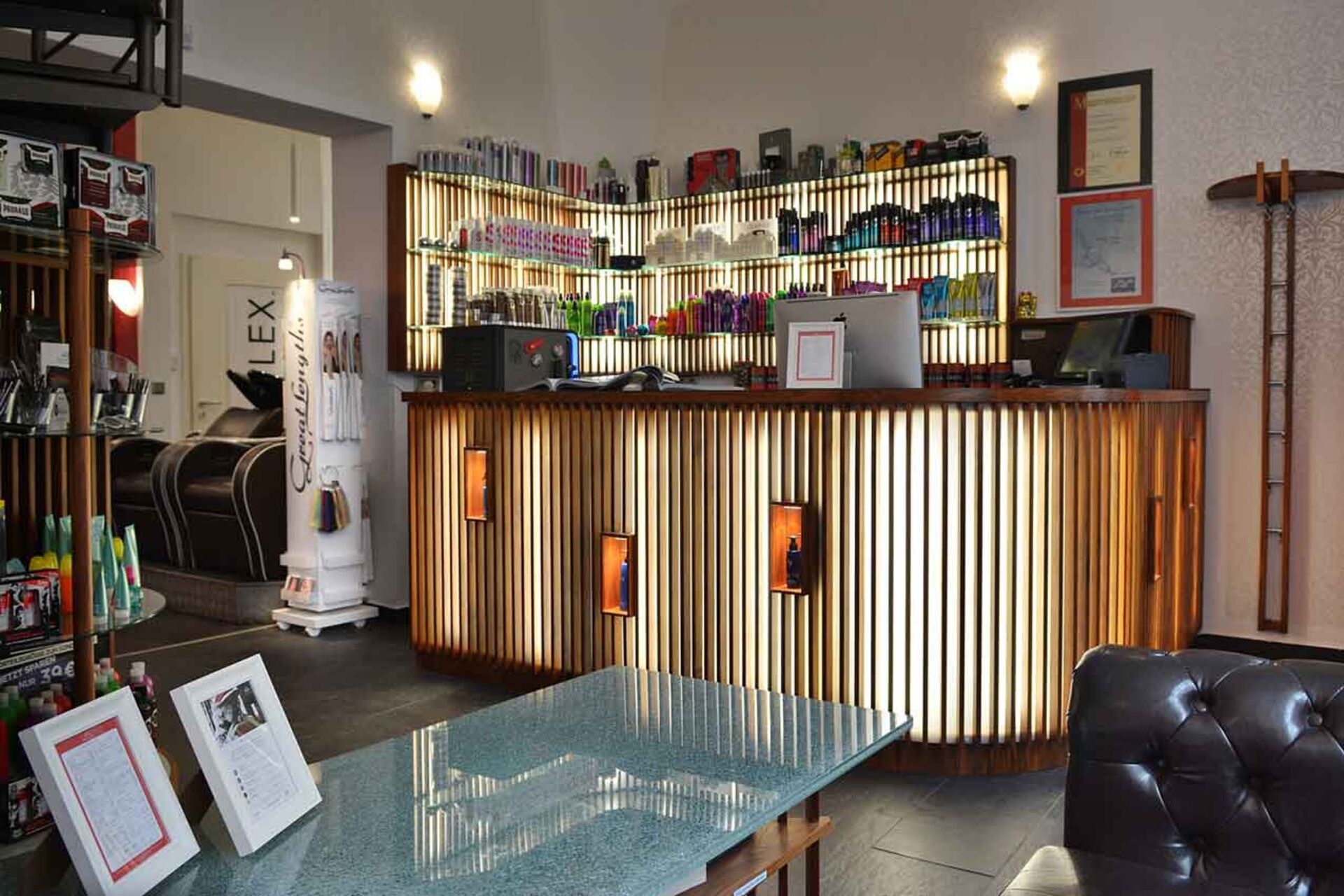 Tritt man in den Dresdner Friseursalon ein, erwartet einen ein vielfältiger Salon, der von einem privaten Vintage Barbier Stübchen über eine White Lounge, bis hin zu einer Sommerterrasse alles zu bieten hat. Hohe Decken mit Stuck, kräftige Wandfarben in rot und braune Möbel bieten ein nettes Ambiente voller Eleganz. So fühlt man sich wohl!