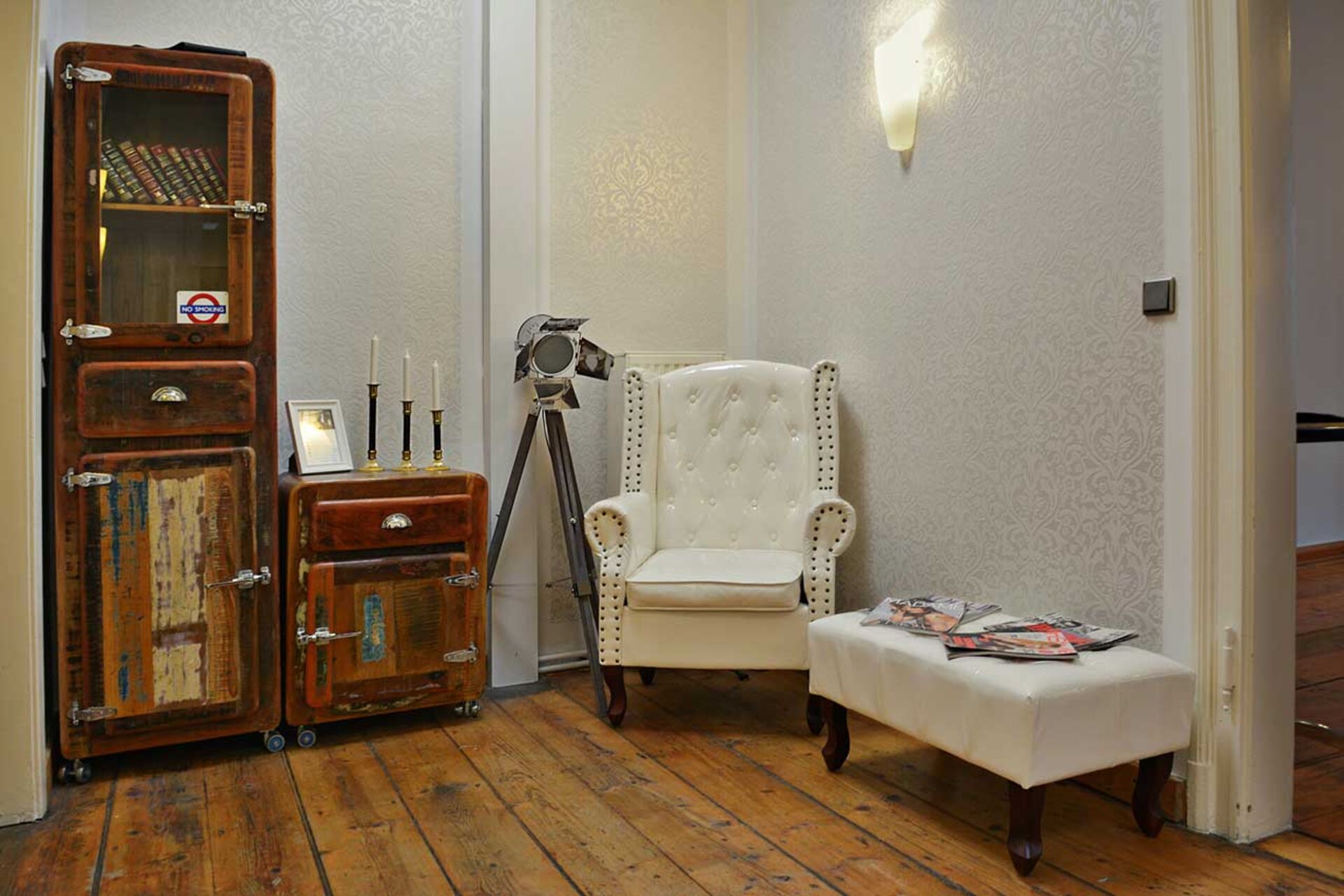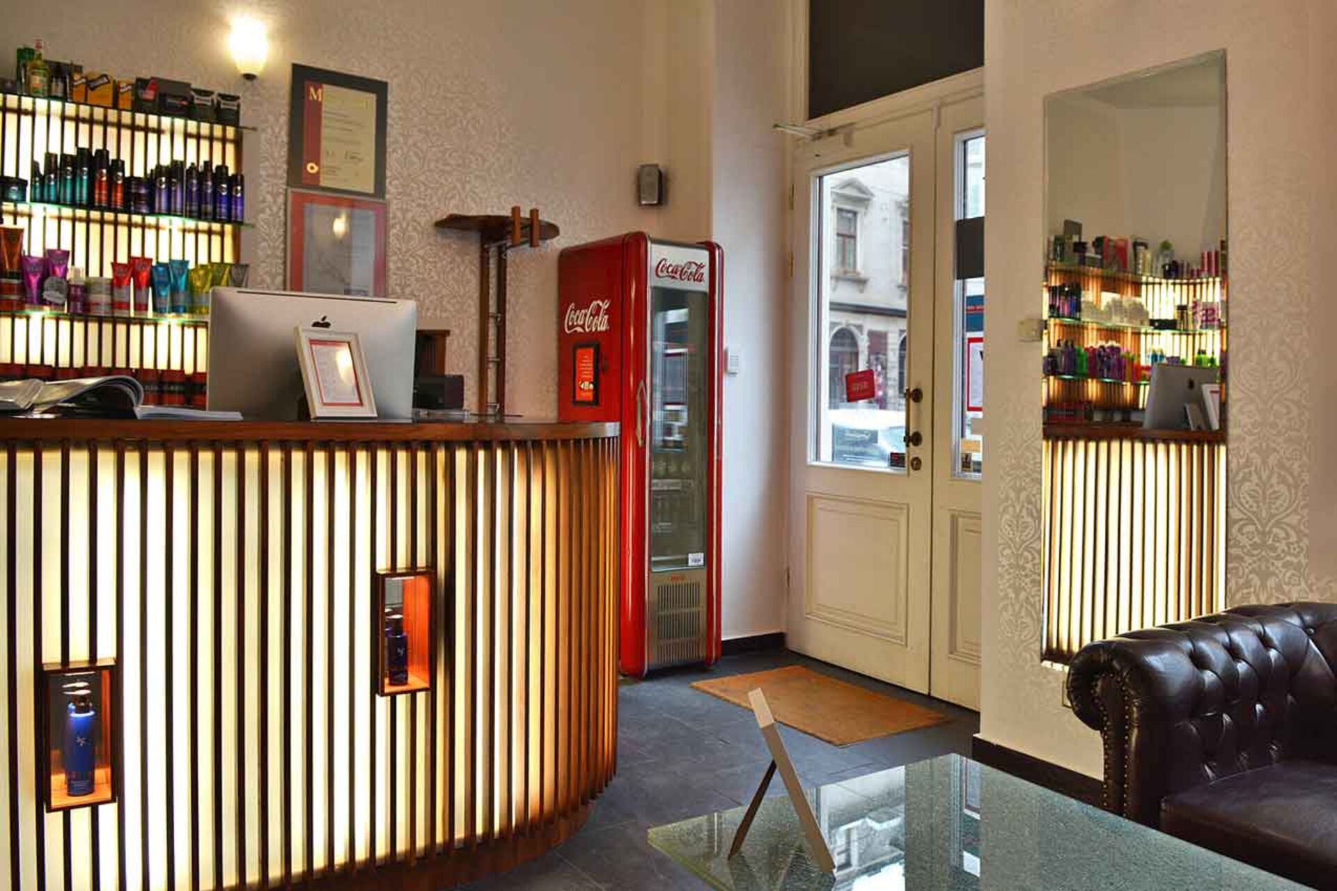 Der gelblich leuchtende Rezeptionstresen bringt Wärme und Licht in den Eingangsbereich. Die hohen Decken geben dem eher kleineren Bereich viel Raum und Luft und lassen schon hier Platz für Kreativität. Zugleich dient diese Zone auch als Warteecke. Hier stehen den KundInnen zwei dunkelbraune Chesterfield Sofas zur Verfügung, die sie zum Entspannen und Warten nutzen können. Und falls es jemanden dürstet, kann sich ein kühles Getränk aus dem roten Coca-Cola Kühlschrank genommen werden.