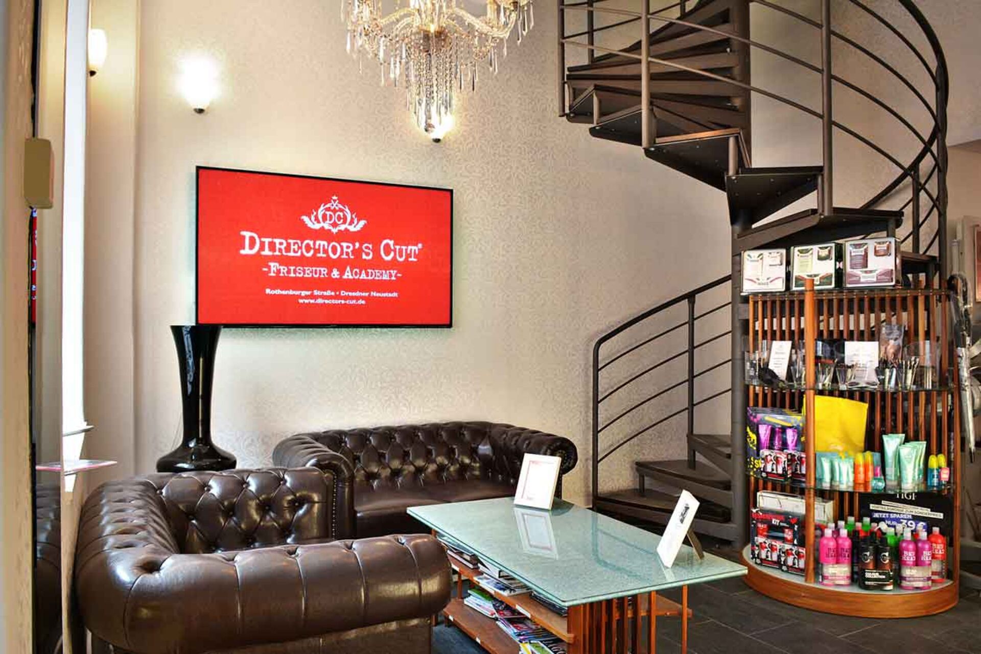 Im oberen Bereich gibt es eine Barber-Area im Vintage Stil. Dielenboden und retromäßige, hölzerne Schränke fügen das Bild zusammen. Außerdem ist in der oberen Etage die Director’s Cut Academy. Die rote Wandfarbe und die braunen Sessel prägen auch hier den Raum.