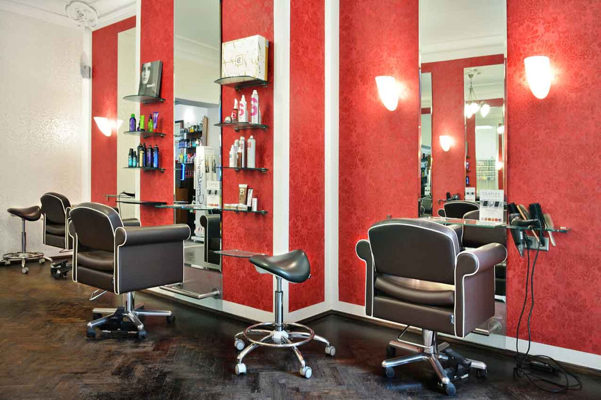 Hohe Decken mit Stuck, große lange Fenster und ein schlichter Kronleuchter im Frisierbereich erwecken den Anschein eines kleinen, aber feinen lichtdurchfluteten Saals. Die unauffällig auffälligen und intensiven Wandfarben in rot und weiß geben dem Raum Intensität, Eleganz und zugleich Gemütlichkeit. Dunkelbraune Frisierstühle ergänzen farblich das ganze Konzept des Raumes, ebenso den dunklen Parkettboden.