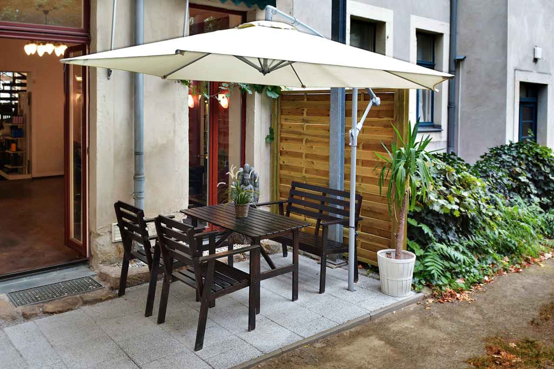 Die White Lounge ist komplett in Weiß gehalten – nur der braune Parkettboden gibt hier dem Raum farblichen Kontrast. Hier ist absolute Privatsphäre garantiert. Von hier gelangt man zur Außenterrasse, die wohl das Highlight des Salons ist. Der Sommergarten bietet viel Platz und Ruhe zum Entspannen. Wer mit seinem Termin fertig ist, kann es sich hier noch bequem machen, ein bisschen plaudern und seinen letzten Schluck Kaffee genießen.
