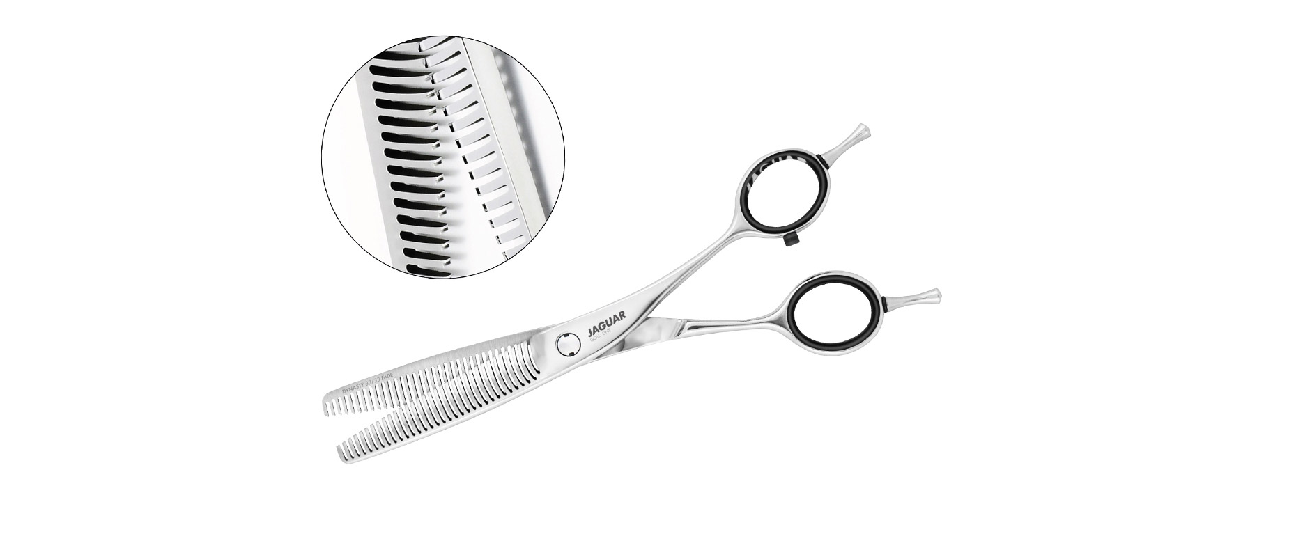 Besonders gut eignet sich die doppelte Effilierschere (Größe 6.0‘‘) für Fade Cuts. Denn die 33 Effilierzähne mit zusätzlicher Prismenverzahnung plus integriertem Führungszahn sorgen für ein besonders feines Schnittbild und angenehm sanftes Schneidegefühl.