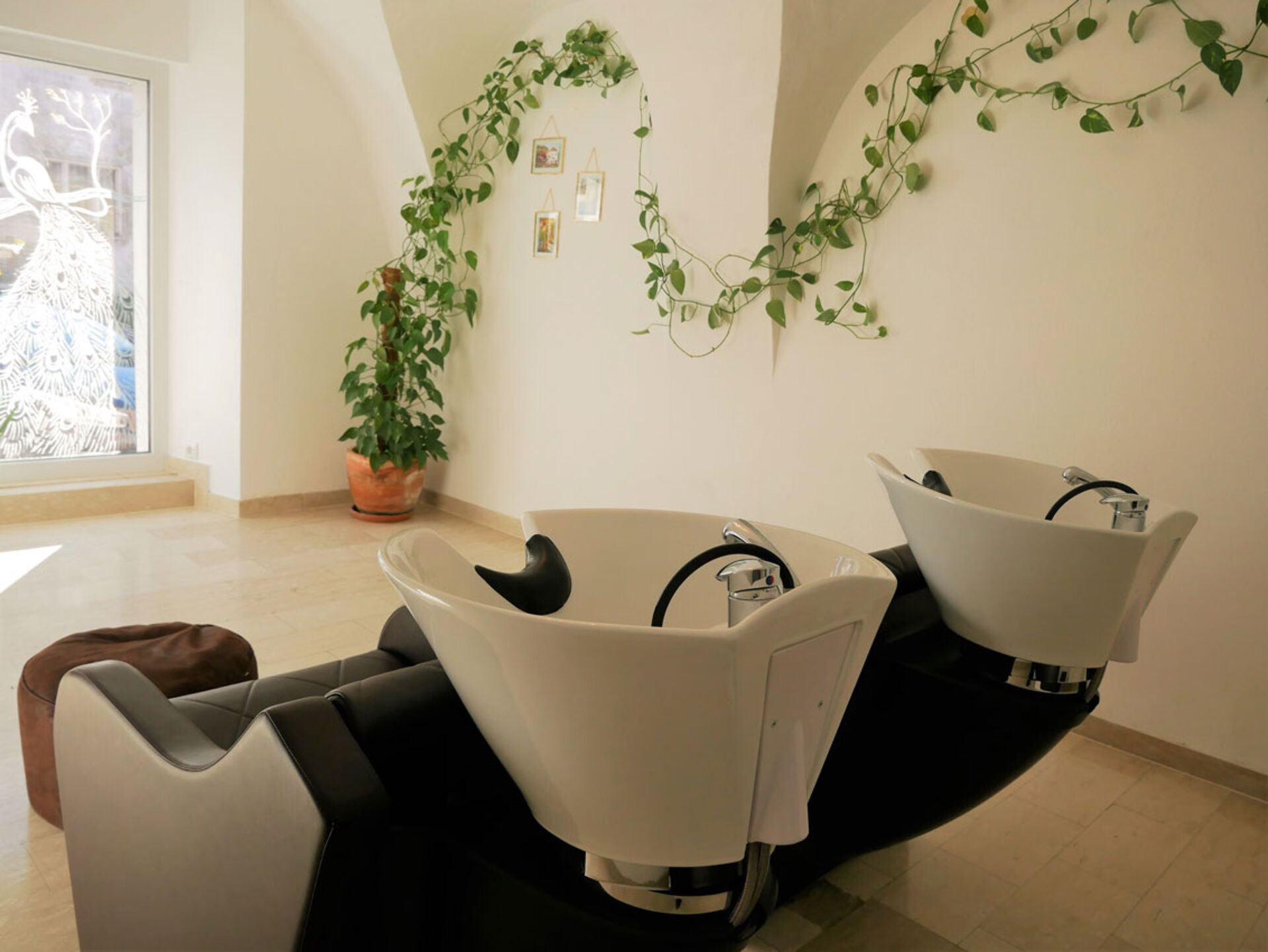 Angenehm ist auch der Waschbereich gestaltet: Platziert im wunderschönen historischen Gewölbe lädt dieser zum Ankommen ein. Mit der grünen Pflanze sind Ruhe-Oase Vibes inklusive. Besonders sind die eindrucksvollen Kreidemalereien an den Schaufenstern. Salon-Inhaberin Martina Zink ist nicht nur Friseurin, sondern auch Künstlerin. Sie erstellt die Glasmalerei selbst und erneuert die Kunstwerke regelmäßig, den Jahreszeiten angepasst.