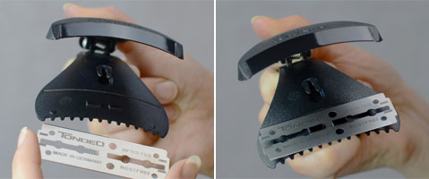 Der BLAZOR („Blade“+„Razor“) - made by Tondeo - schreibt keine bestimmte Arbeitstechnik vor und lässt viel Raum für eigene Kreativität. Für Handhaltung und Arbeiten gilt: Er wird intuitiv und individuell gehandhabt - ganz ohne Schulung. Durch die Nähe der Hand zur Klinge ist gefühlvolles Arbeiten möglich, so dass die Schnitt-Effekte mit Fingerspitzengefühl variierbar sind: weiche Grundlänge, fließende Übergänge, das Setzen modischer Akzente - alles möglich! Mitentwickler Ron Schumann, Friseurmeister aus Coesfeld, ist überzeugt: „Die gebogene Klinge sorgt für ein Maximum an Stabilität für exaktes Arbeiten!“