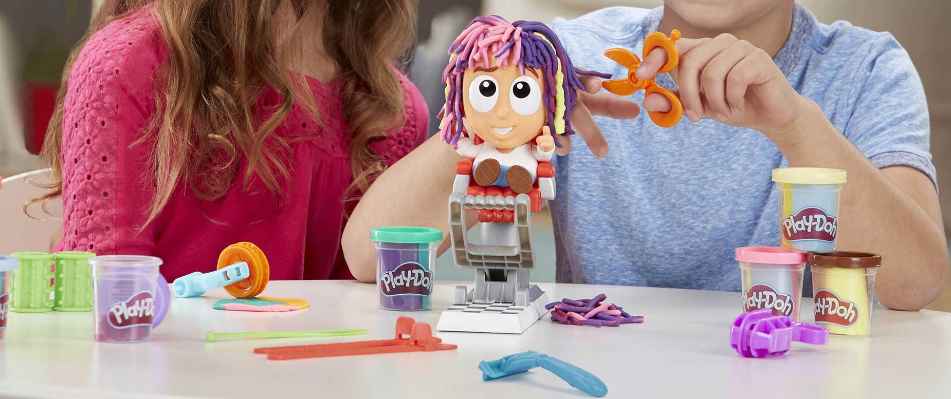 Der kleinste Friseur-Nachwuchs hat die Möglichkeit, bei „Verrückter Freddy Friseur“ Salon-Luft zu schnuppern und seiner Kreativität freien Lauf zu lassen. Wenn die Play-Doh Haare am Kopf immer länger und länger werden kann man zu unterschiedlichsten Utensilien greifen und Haarstyles kreieren. Schere, Lockenwickler, Haarspangen für Zöpfe oder ein Spielrasierer für einen Razor Cut. Dazu wird die Play-Doh Kunden-Version auf den Plastik-Friseurstuhl platziert und los geht es.