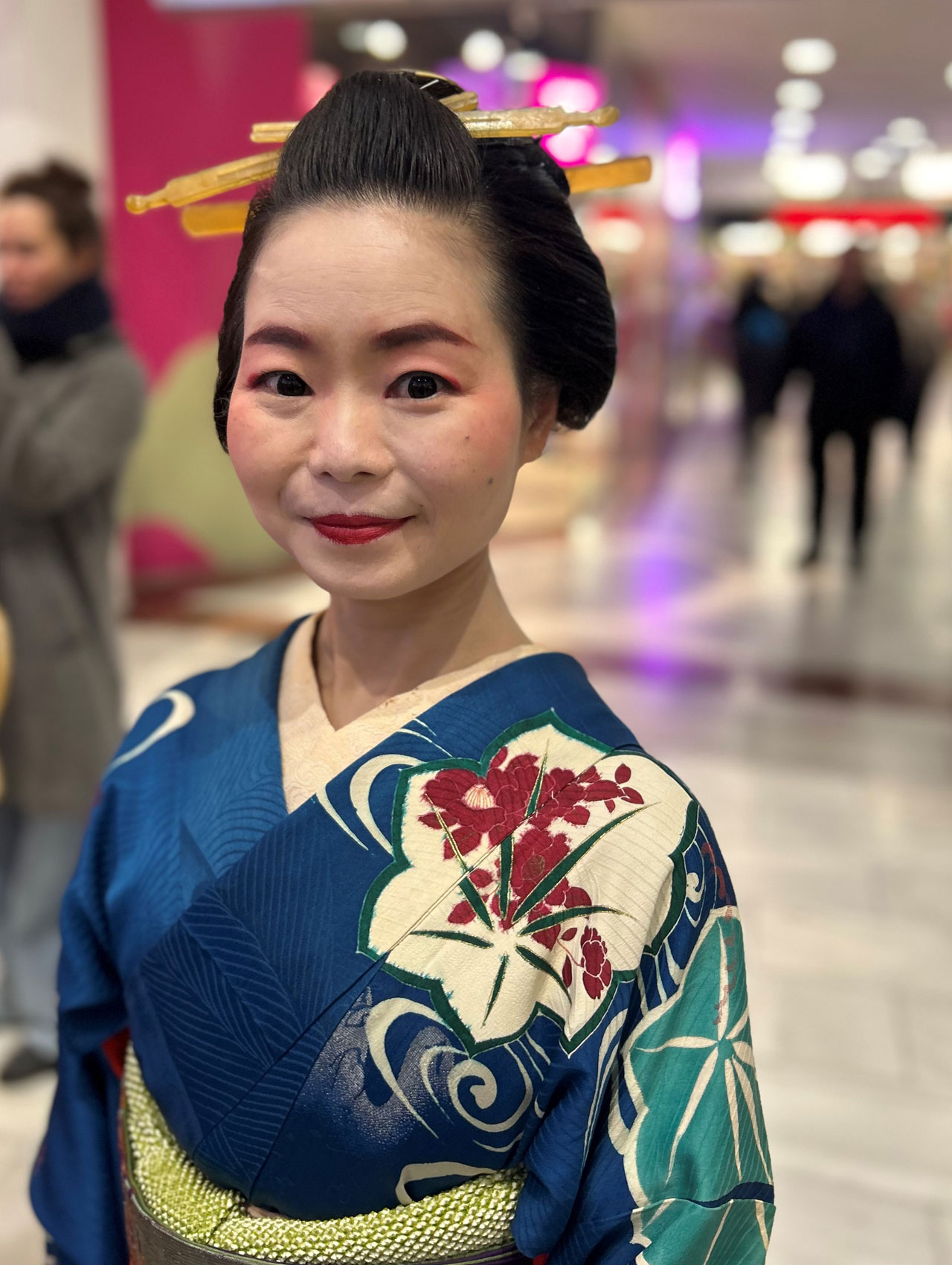 Erklärt wurden zudem Bedeutung und sozialer Status, Beruf oder die Lebensphase der Trägerin. Die Stoffe, Muster und Farbenpracht der kunstvollen Kimons waren beeindruckend! Diese bestehen zumeist aus zwölf oder mehreren einzelnen Stücken und müssen auf bestimmte Weise angelegt werden - etwas, das der Trägerin ohne Hilfe nicht gelingen kann.