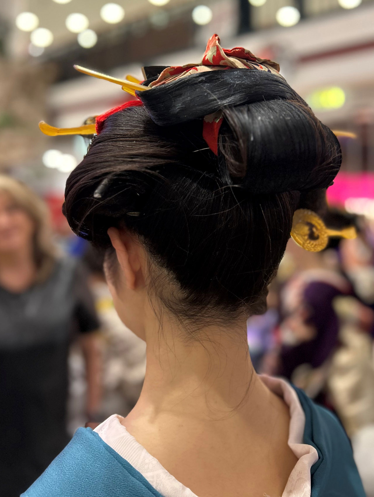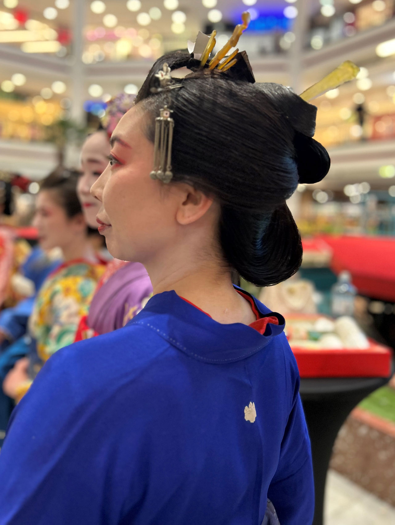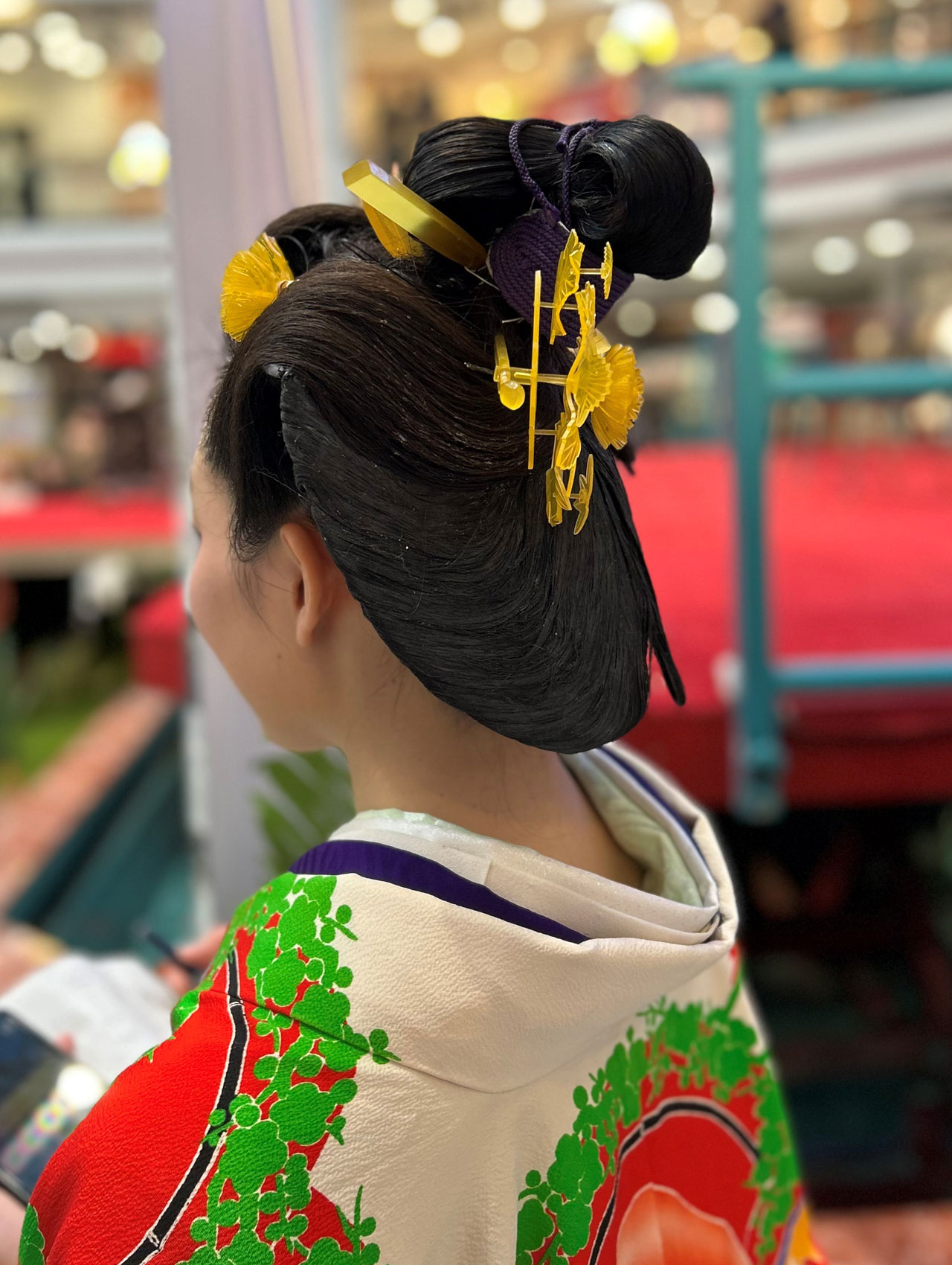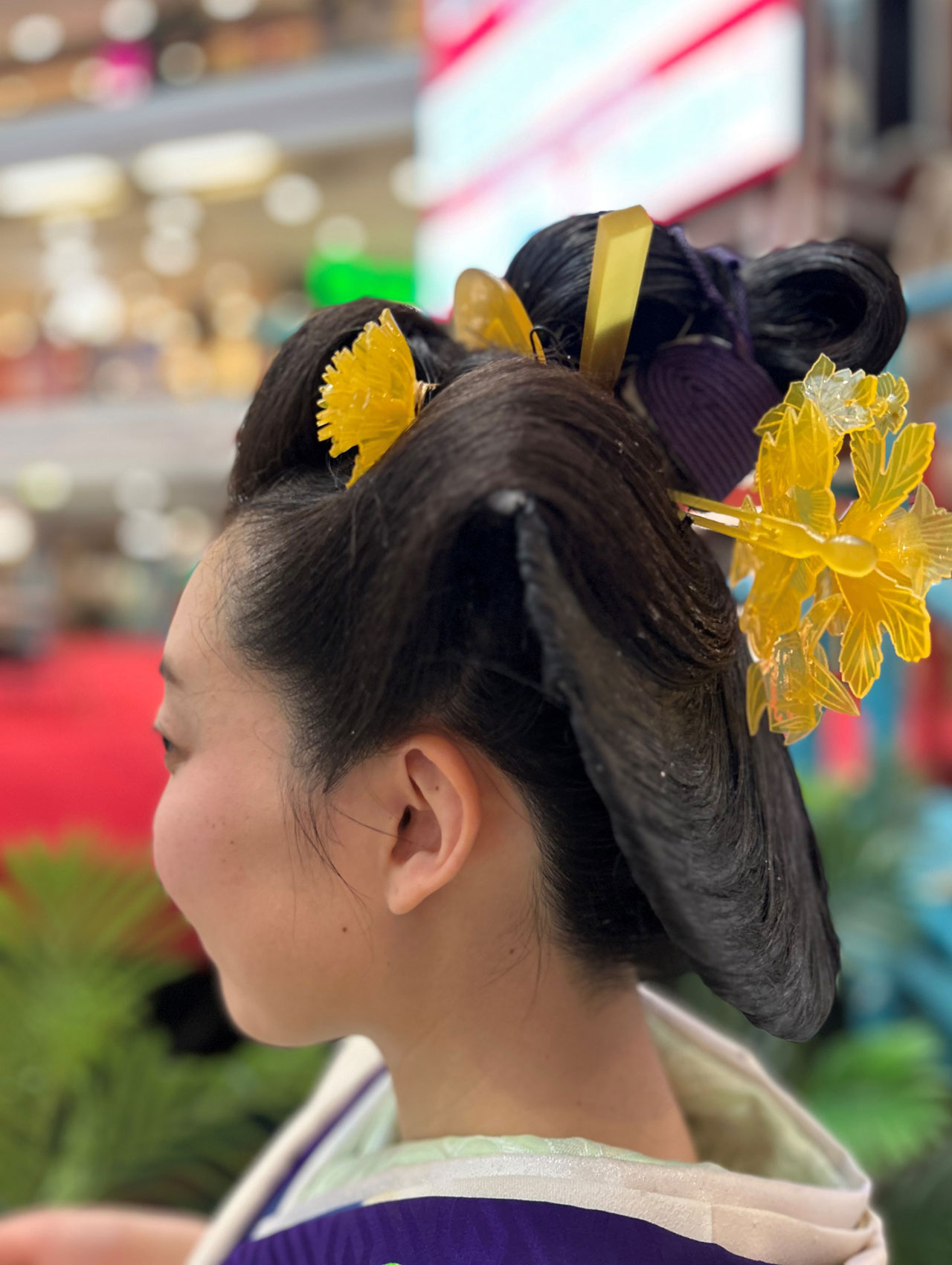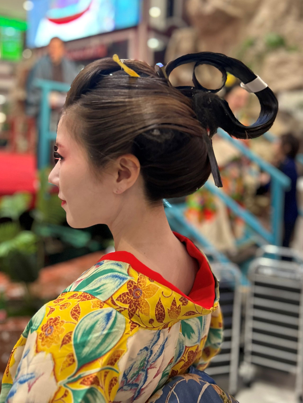 Zu sehen waren kunstvolle Volumenfrisuren aus der Edo-Zeit (Erklärung, s. unten) mit komplexen Formen, aufwendigen Knoten und Bögen sowie kunstvollem Haarschmuck und Make-up. Um die Frisuren zu formen, werden Kämme, Nadeln (Kanzashi) und Bintsuke-Abura (eine traditionelle japanische Pomade aus Wachs und gehärtetem Kamillenöl) verwendet sowie Verstärkungen aus Papier oder Draht.