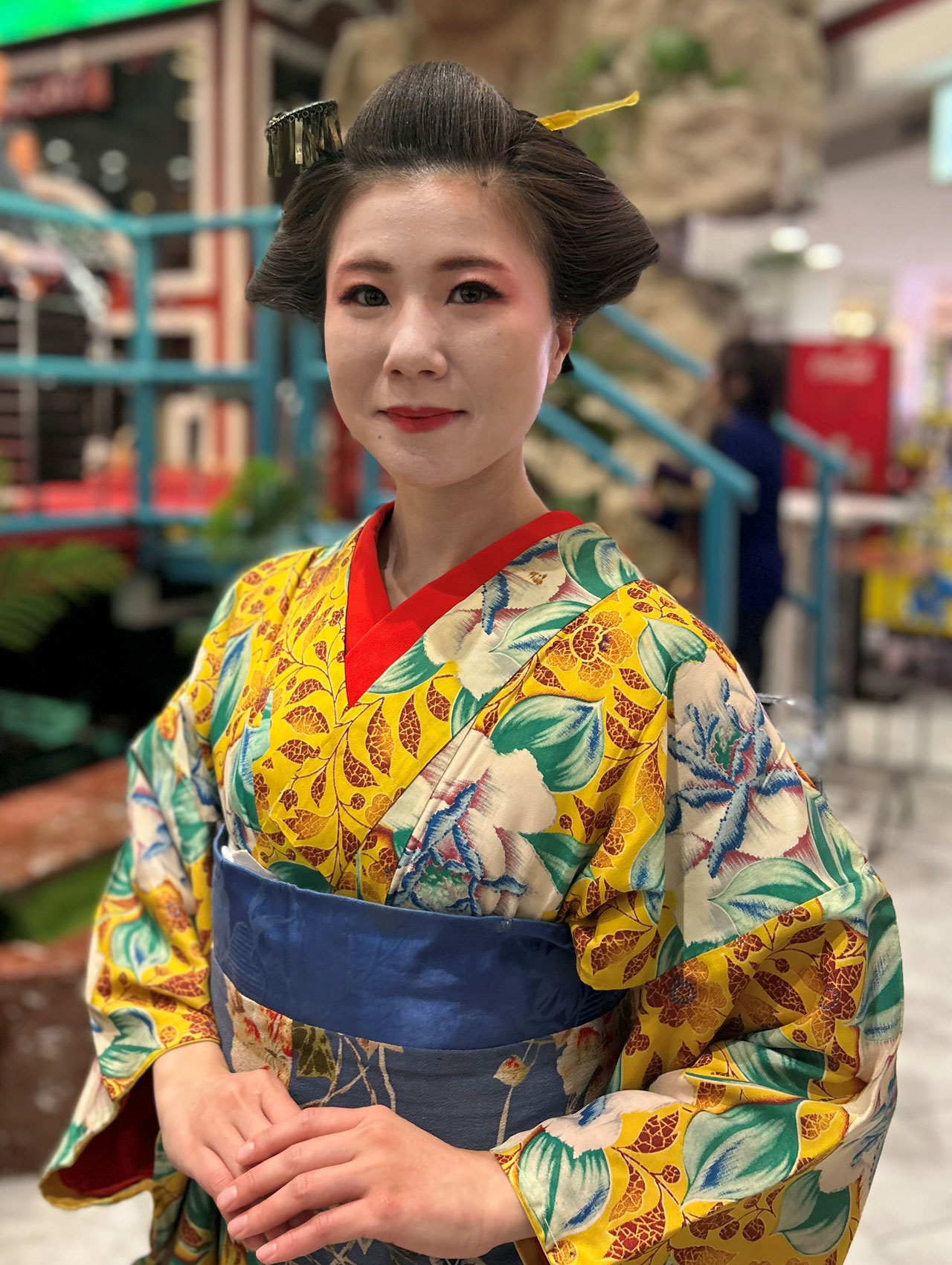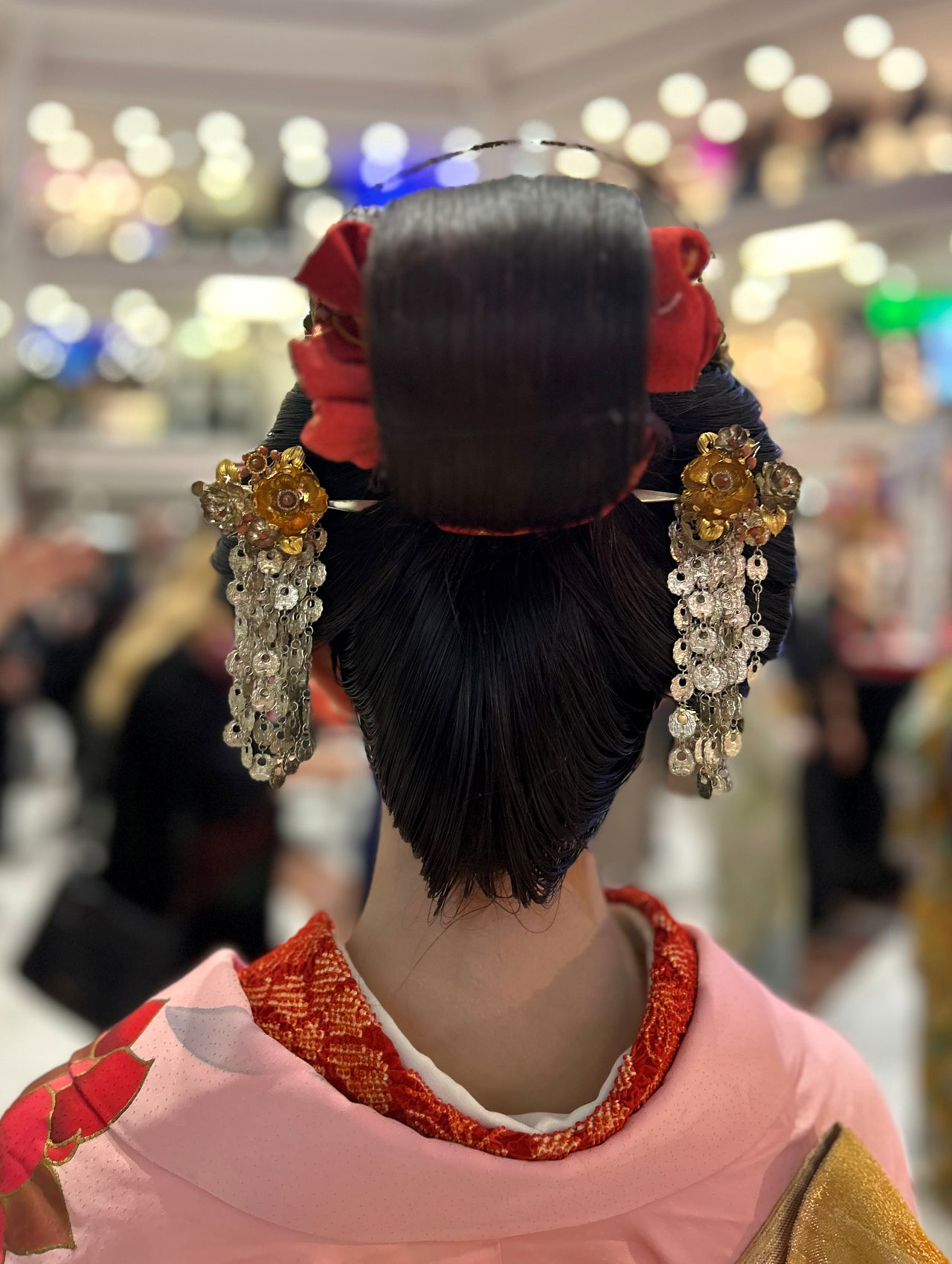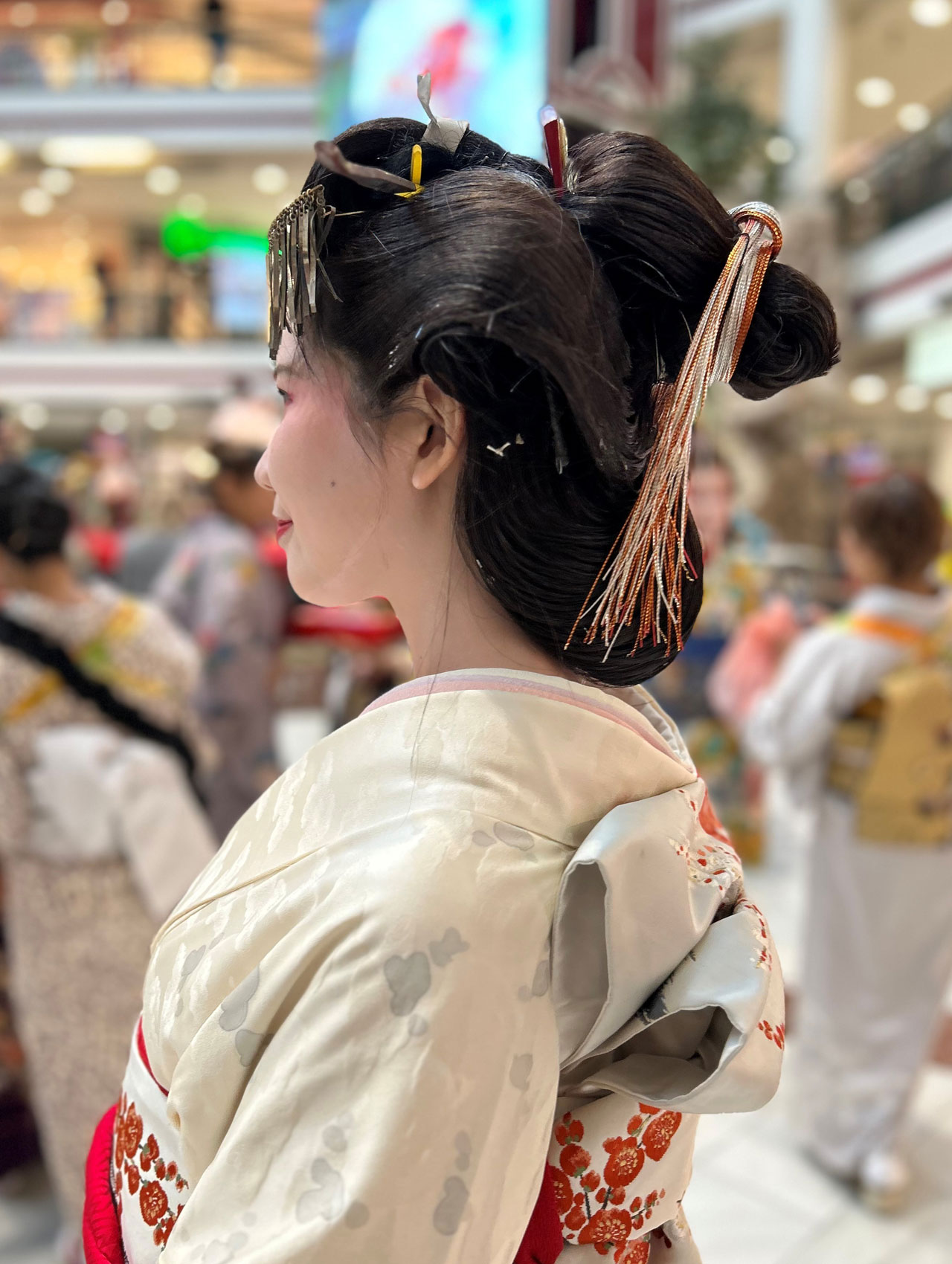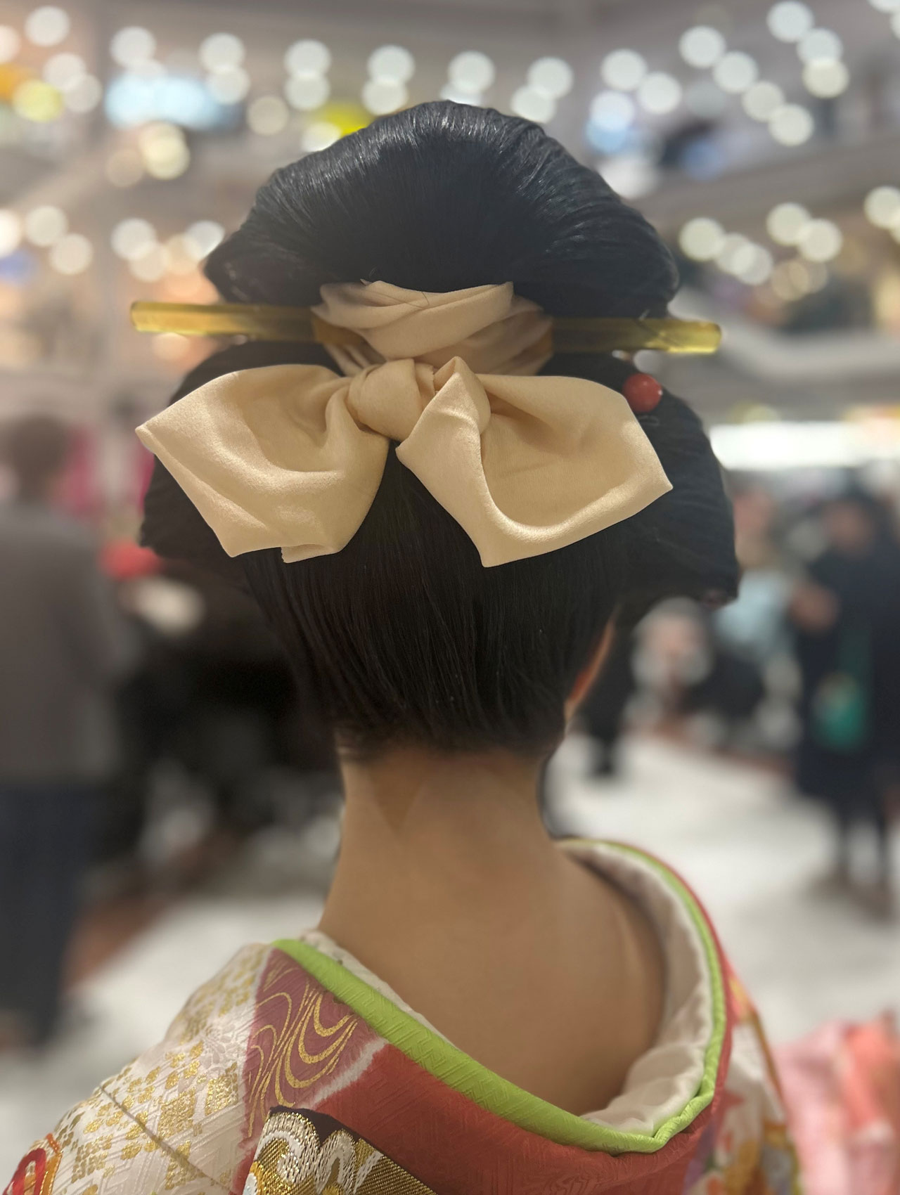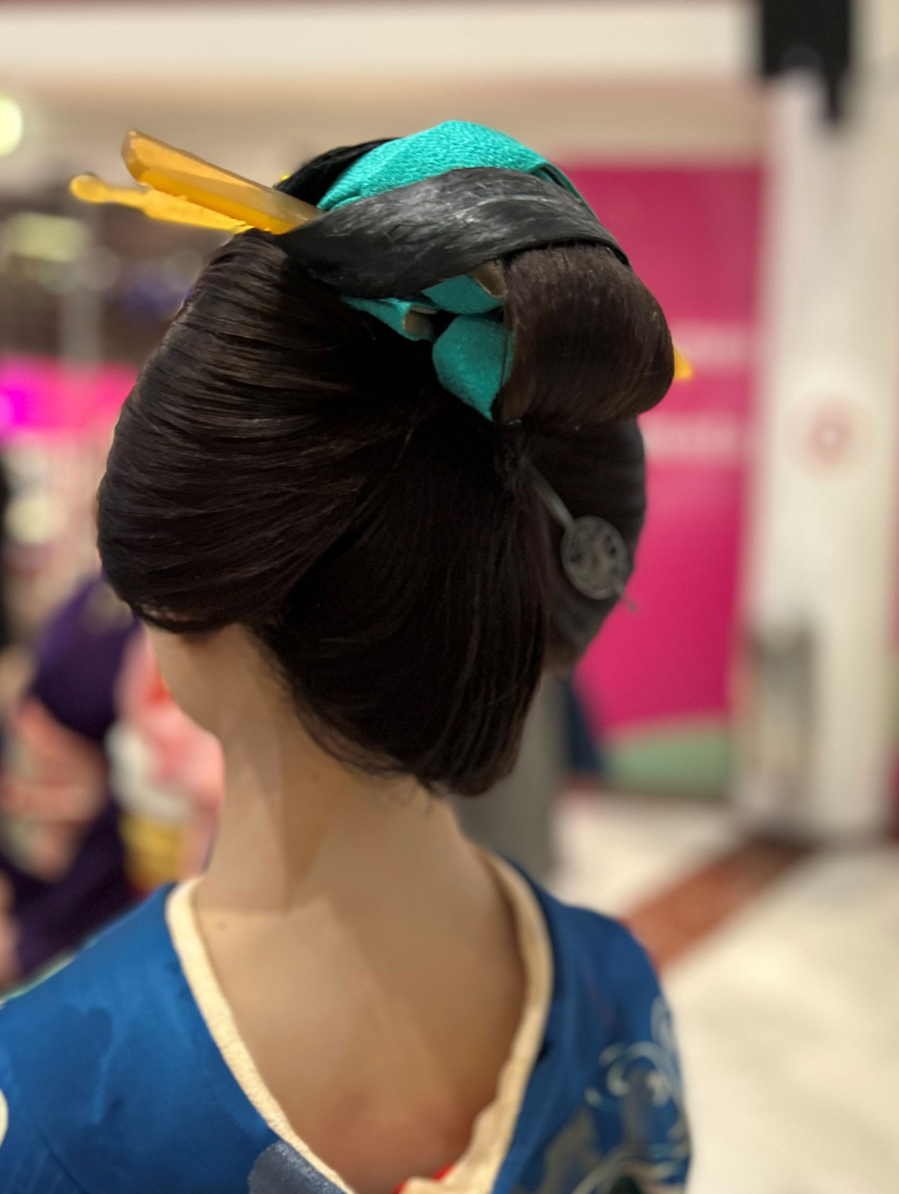 Zu sehen waren kunstvolle Volumenfrisuren aus der Edo-Zeit (Erklärung, s. unten) mit komplexen Formen, aufwendigen Knoten und Bögen sowie kunstvollem Haarschmuck und Make-up. Um die Frisuren zu formen, werden Kämme, Nadeln (Kanzashi) und Bintsuke-Abura (eine traditionelle japanische Pomade aus Wachs und gehärtetem Kamillenöl) verwendet sowie Verstärkungen aus Papier oder Draht.