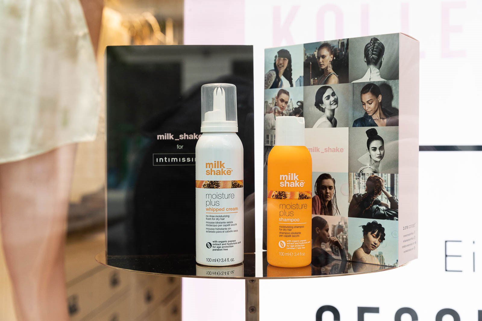 Die milk_shake moisture plus Serie ist das neue Herzstück der Marke, welches ab sofort in den Schaufenstern der Intimissimi Läden präsentiert wird. Bei einem Einkauf ab 60€ im Intimissimi-Store gibt es ein milk_shake® moisture plus Kennenlern-Set als Travel Hairstyle Kit gratis, inklusive 5€-Gutschein, der beim nächsten Friseurbesuch in teilnehmenden Partnersalons eingelöst werden kann. Die Besonderheit der Marke liegt darin, dass die Produkte reich and natürlichen und zertifizierten organischen Inhaltsstoffen sind, die zusätzlich kein Paraben und kein Sulfat beinhalten. Die Serie besteht aus vier Produkten: Shampoo, Conditioner, ein feuchtigkeitsspendenden Leave-In Schaum und eine brandneue moisture plus hydrating lotion.