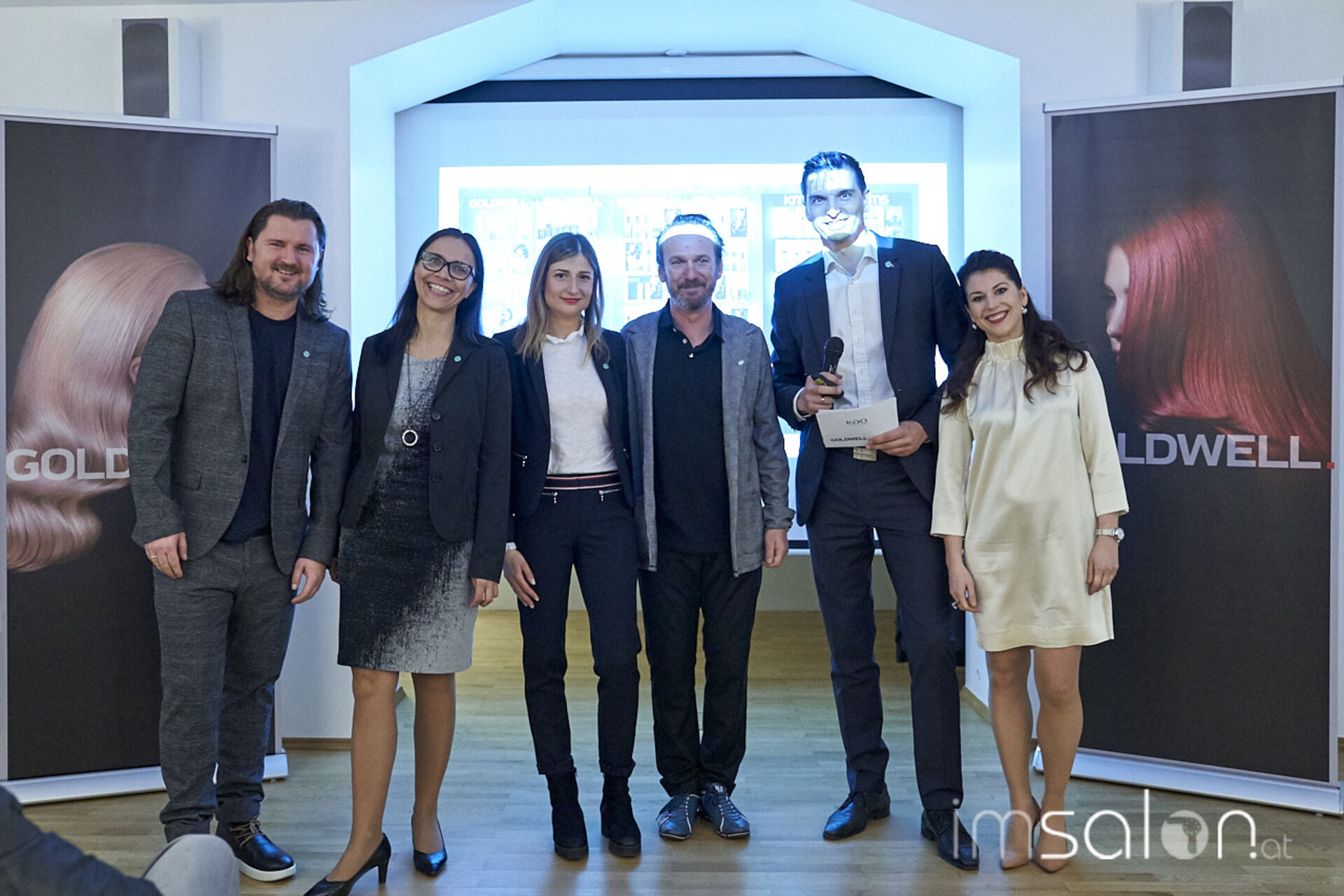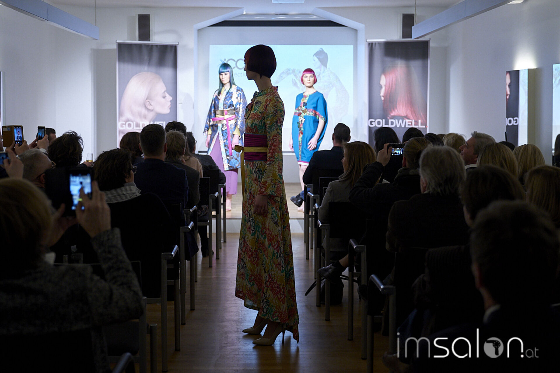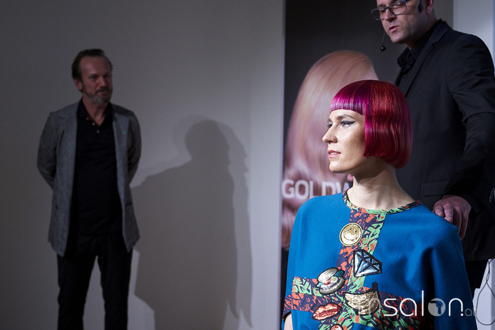 Sascha Haseloff und Mathias Prüll, Goldwell Austria Fachtrainer, erklären onstage die kompakten Outlines und schmalen Silhouetten, die durch harmonische Farbeffekte kraftvoll hervorgehoben werden - minimalistische Stylings mit extremen Glanz-Wow-Effekten!