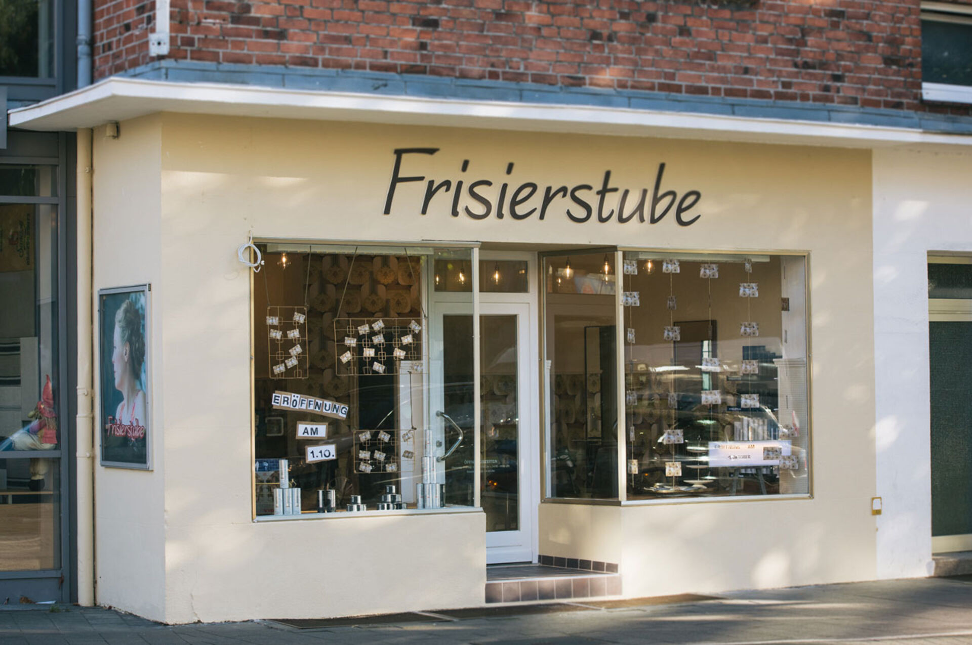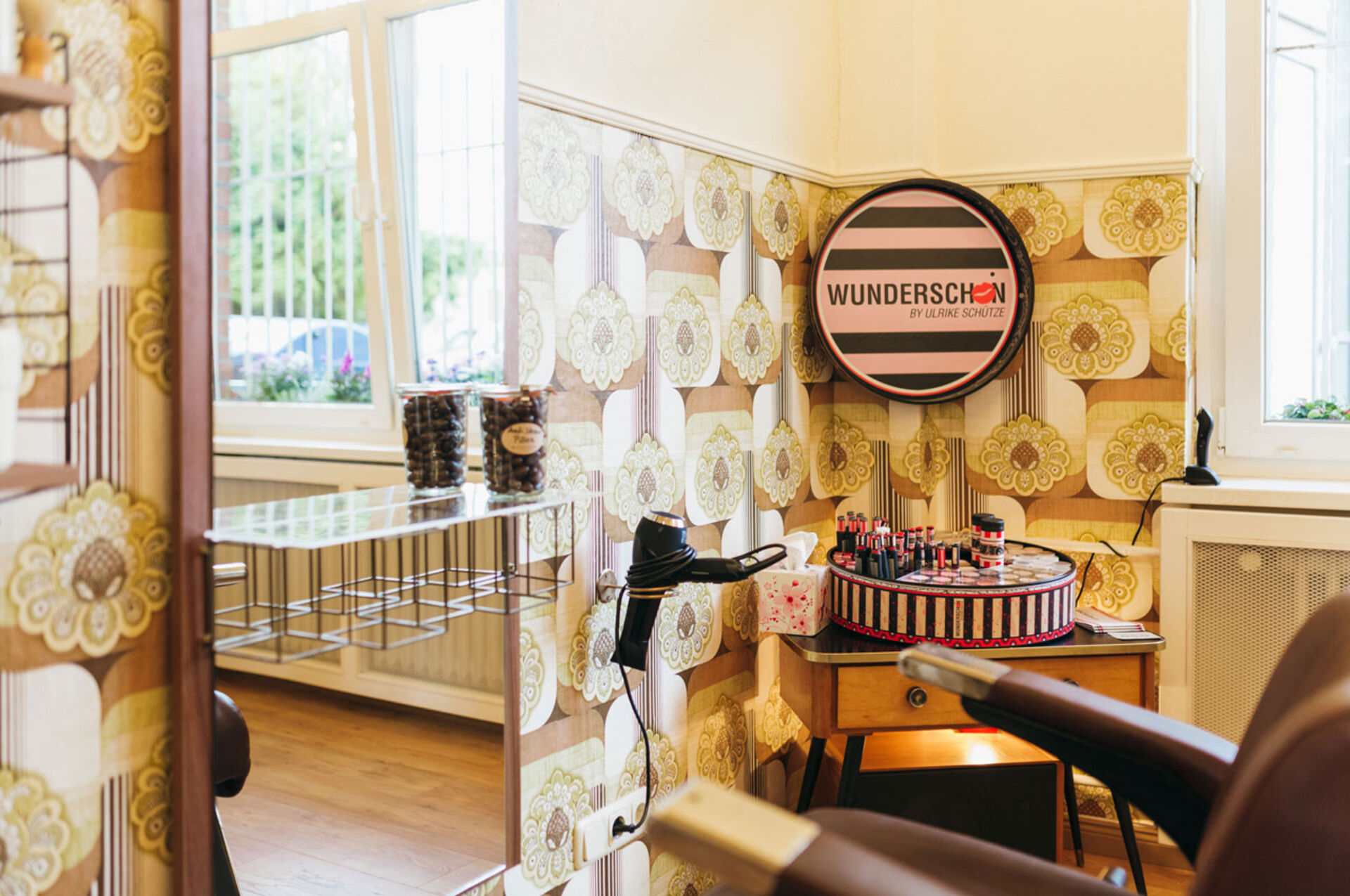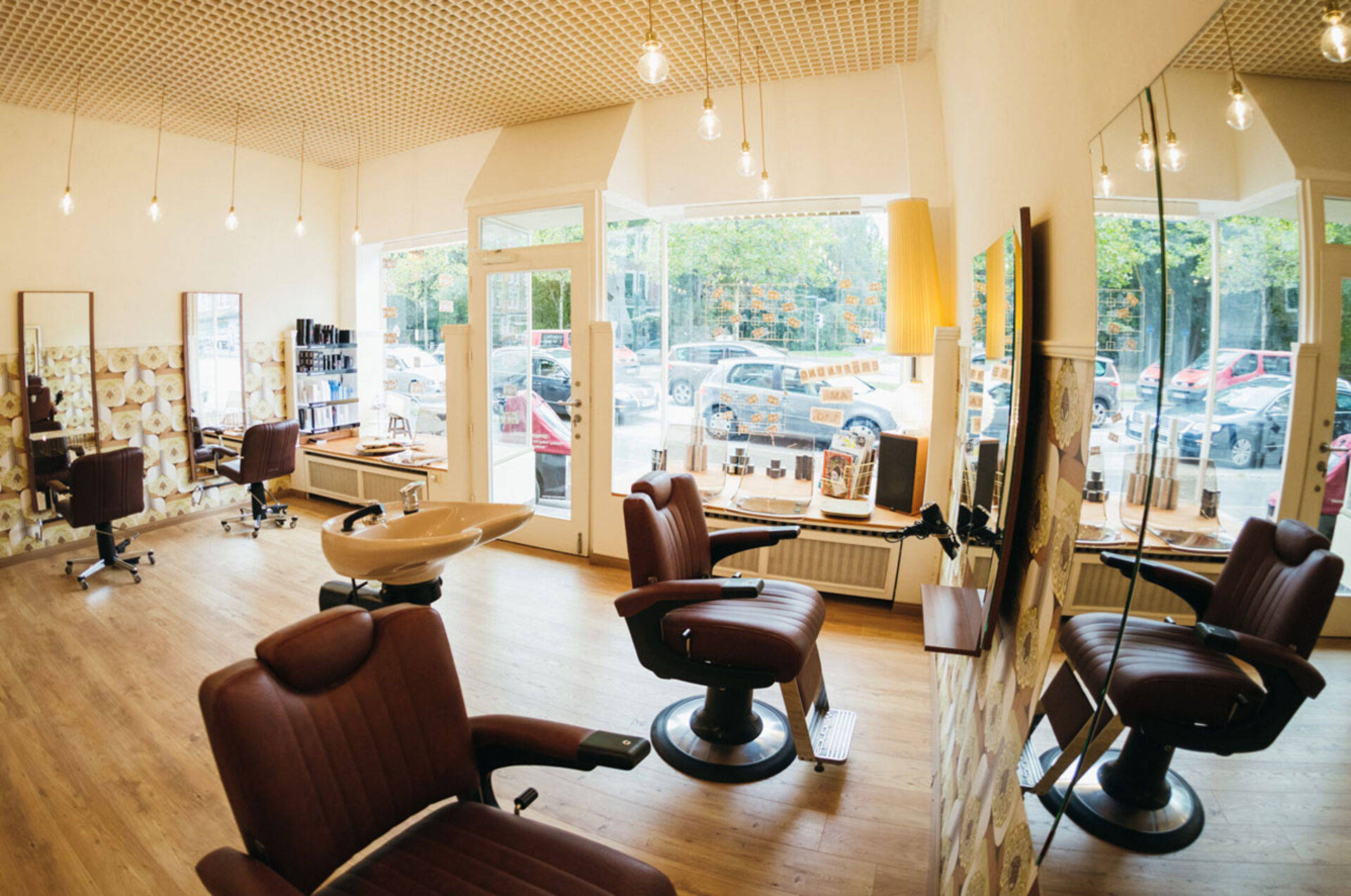 Die Kieler "Frisierstube" bringt absolute Nostalgie-Atmosphäre, verantwortlich dafür sind die Retro-Wandtapeten, die aus dem Entstehungsjahr des Salon-Gebäudes stammt. Erdtöne dominieren und wärmen den Raum. Damit der Raum nicht zu voll wirkt, wurde die Raumgestaltung gekonnt mit viel Licht inszeniert. Die Deckenleuchten sind modern und minimalistisch eingesetzt. Diese Kombination aus Retro-Eyecatchern und reduzierten Elementen lässt den Laden aufgeräumt und nicht zu überladen wirken. Genauso spart das zentrale Waschbassin Raum.