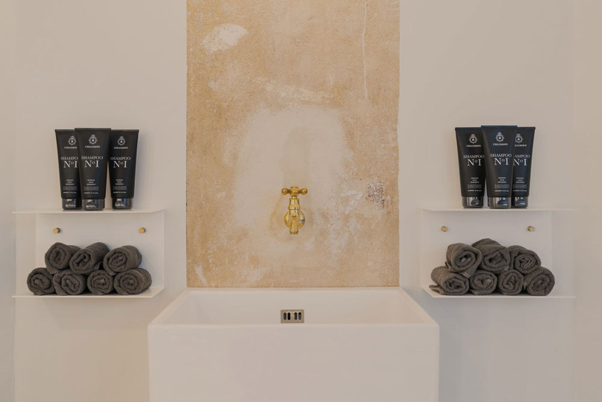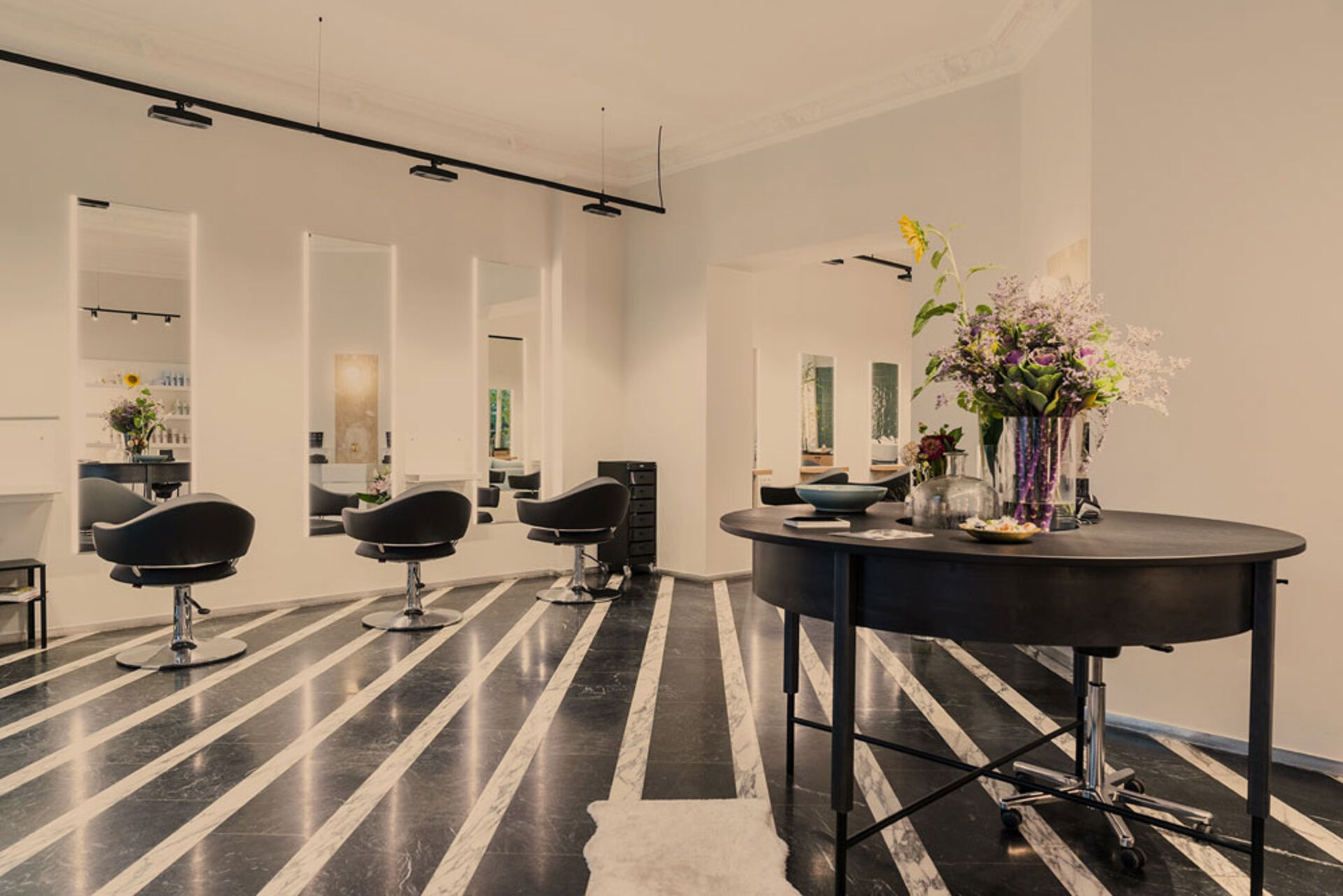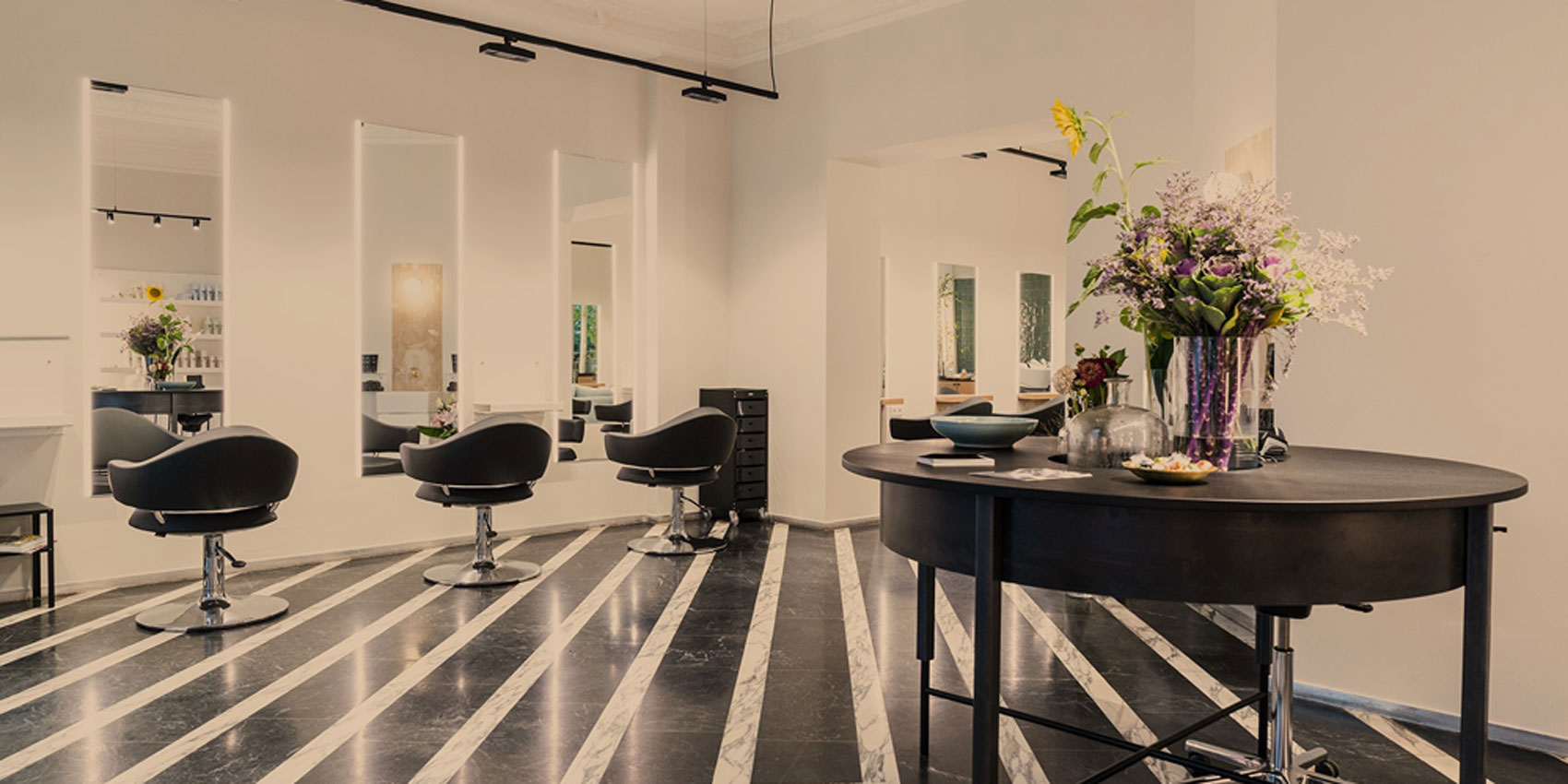 Auf einem ebenfalls schwarzen, aber runden Tisch stehen stets Snacks bereit, die neben den üppigen Blumensträußen in großen Glasvasen angerichtet sind. Das Waschbecken an der beigefarbenen Steinwand gegenüber der Frisierplätzen ist ebenfalls sehr harmonisch gestaltet und zeigt mit dem goldenen Wasserhahn die Liebe zum Detail. Hohe Decken mit Stuck verziert geben dem Raum eine gemütliche Atmosphäre und bringen viel Platz und Luft für Kreativität und neue Ideen. Der Salonname beinhaltet schließlich nicht ohne Grund „Atelier“, denn in diesem Salon hat die künstlerische Freiheit keine Grenzen.