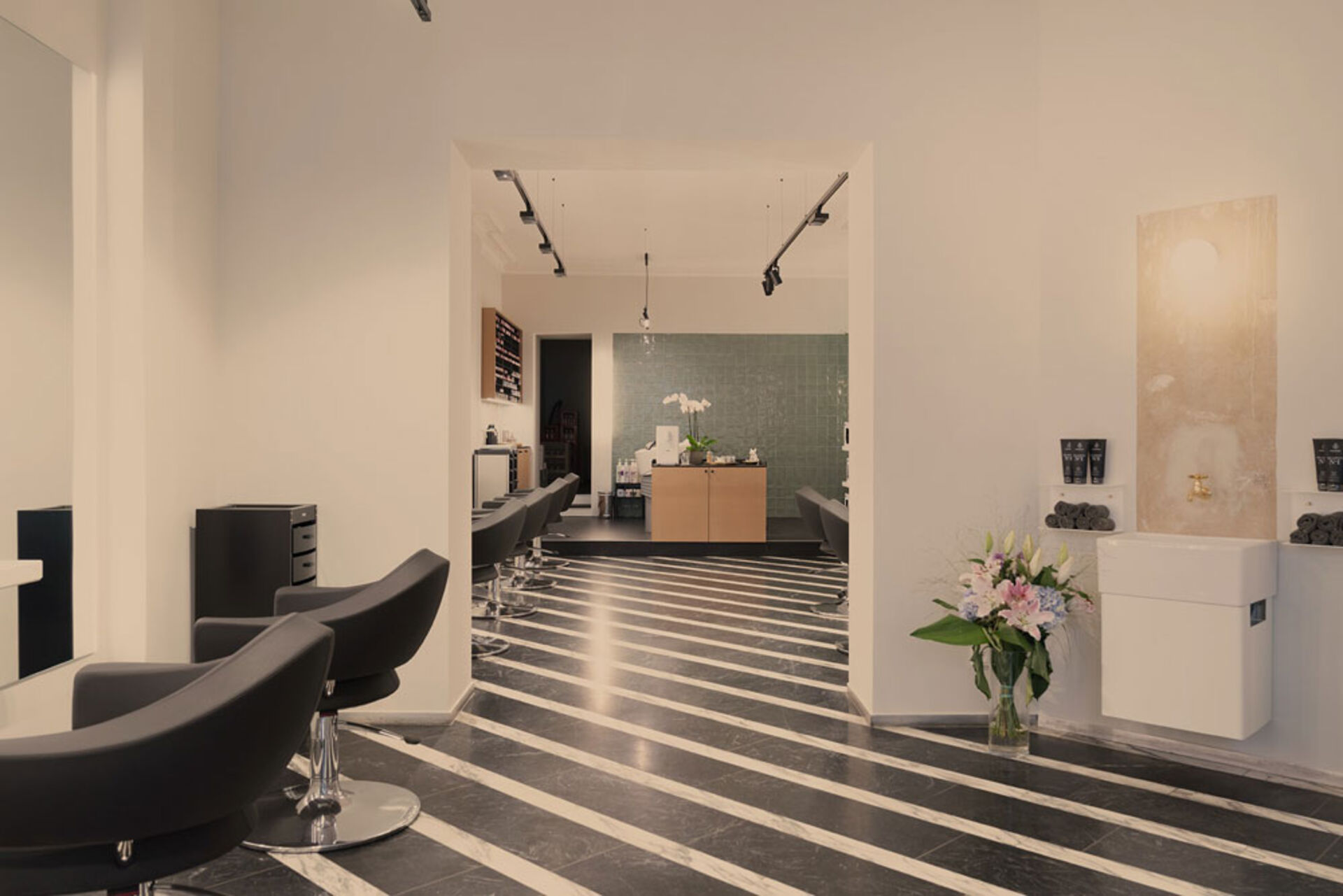 Eine türkisfarbene Mosaikwand im Eingangsbereich ist ein echter Hingucker in dem sonst so neutralfarben gehaltenem Salon. Die bunten Steinchen sind der farbliche Kontrast zu den natürlichen Farben, die den Raum prägen. Der gestreifte Boden und die Einrichtung in Schwarz-weiß setzen das geradlinige Konzept des Friseursalons ideal um. Spiegel mit LED-Lampen an den Seiten spenden zusätzliches Licht und sorgen für perfekte Beleuchtung während des Frisierens.