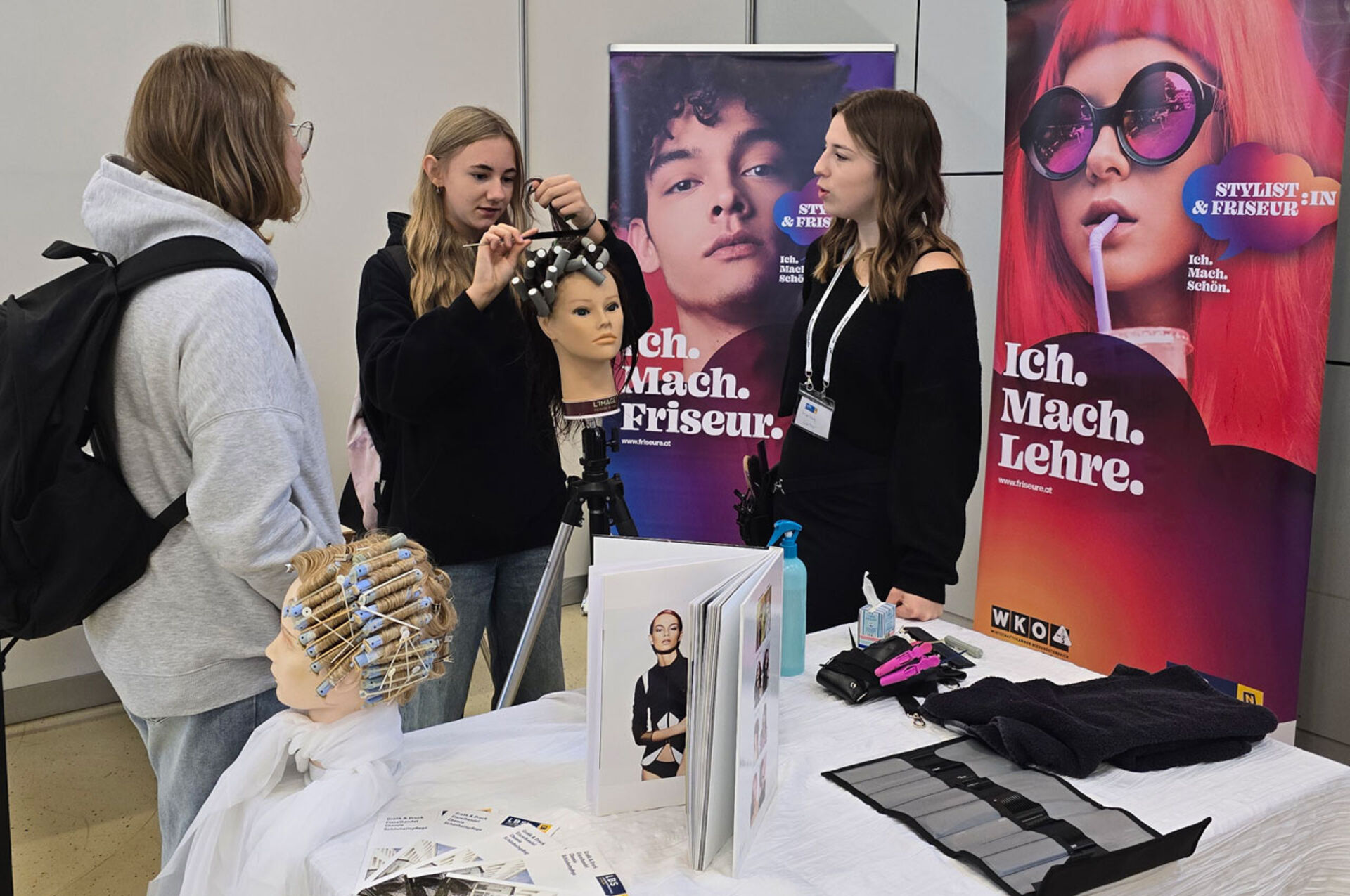 Der Lehrlingsbeauftragten Mst.in Kirstin Eßletzbichler, die u.a. mit Alexandra Glaser-Jurin (Bezirksvertrauensperson) und Claudia Künstle, Salonbesitzerin aus Purgstall an der Erlauf, vor Ort war, war es wichtig, mit den Jugendlichen ins Gespräch zu kommen, ihnen zuzuhören und sie für unsere Branche zu interessieren und zu motivieren. Sie vermittelten zudem den Jugendlichen und deren Eltern, wie kreativ und vielfältig der Friseurberuf ist und welche Möglichkeiten dieser bietet.