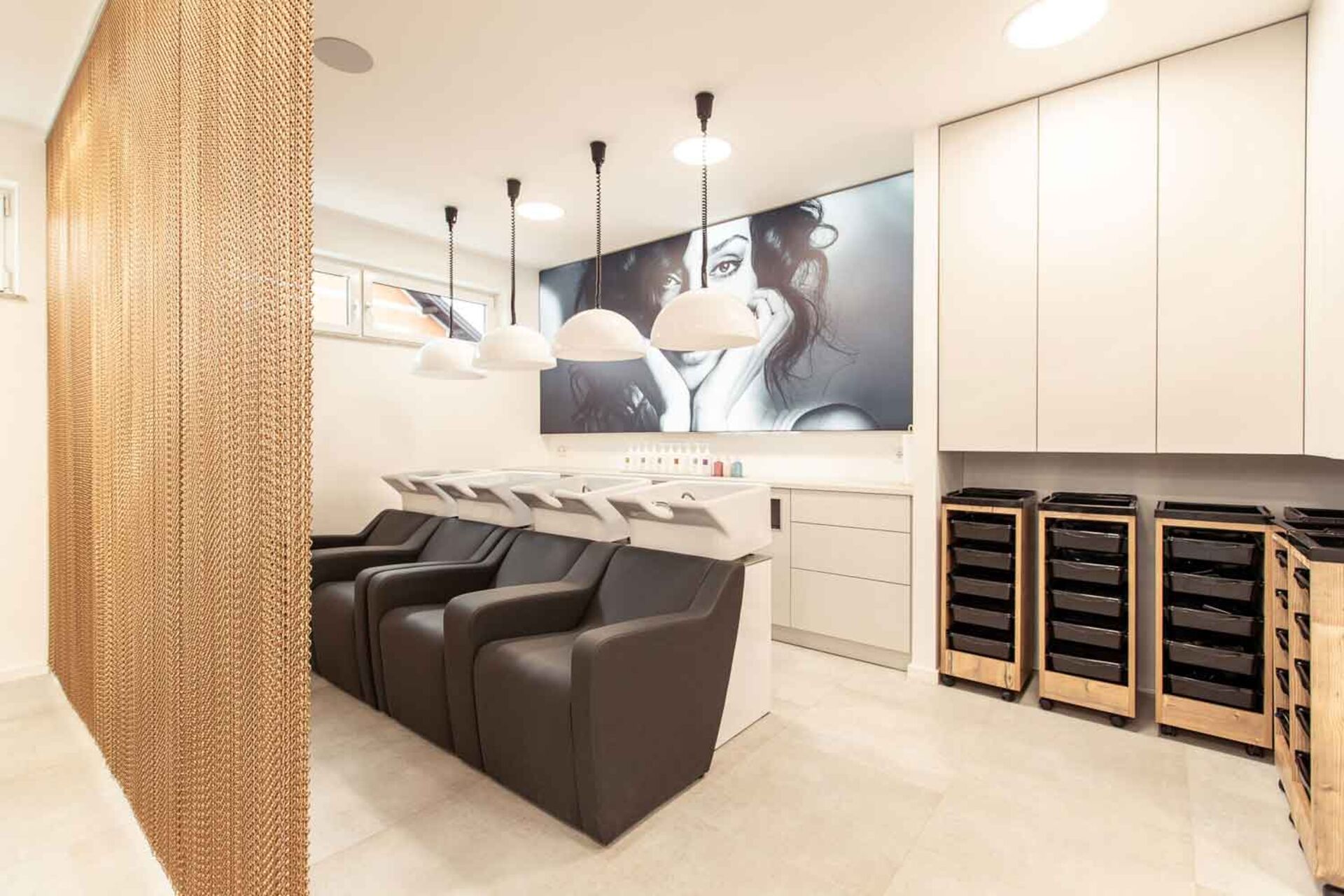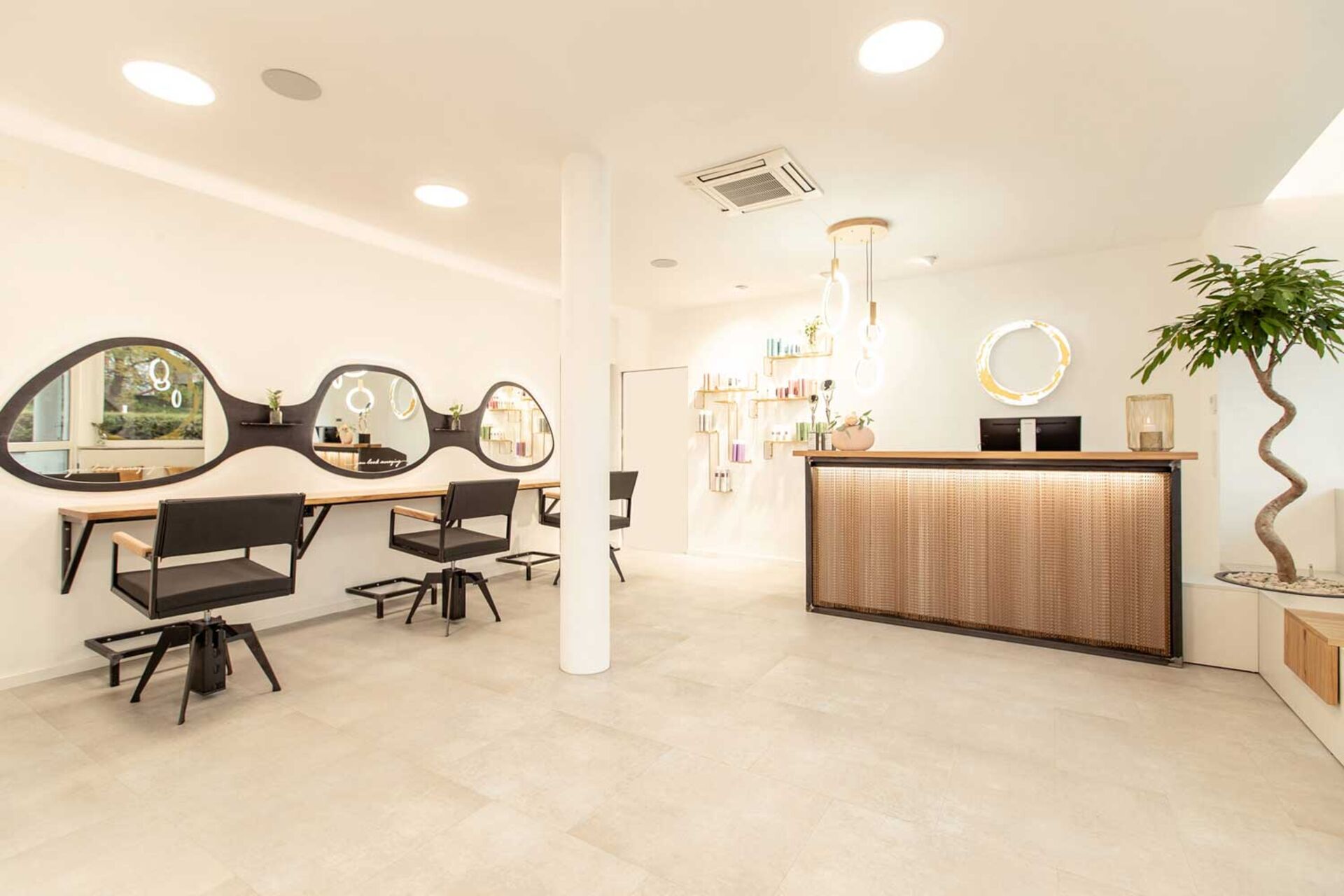 Das helle Innendesign wurde zum größten Teil selbst angelegt. Unterstützung bekamen Eva und David Schwarz und ihr Team von Hermann Gabriel, der auch schon bei den anderen Blickfang-Salons mitgewirkt hatte. Der Wasch- und Mixbereich, genauso wie die Stühle, wurden von dem Inneneinrichter designt.