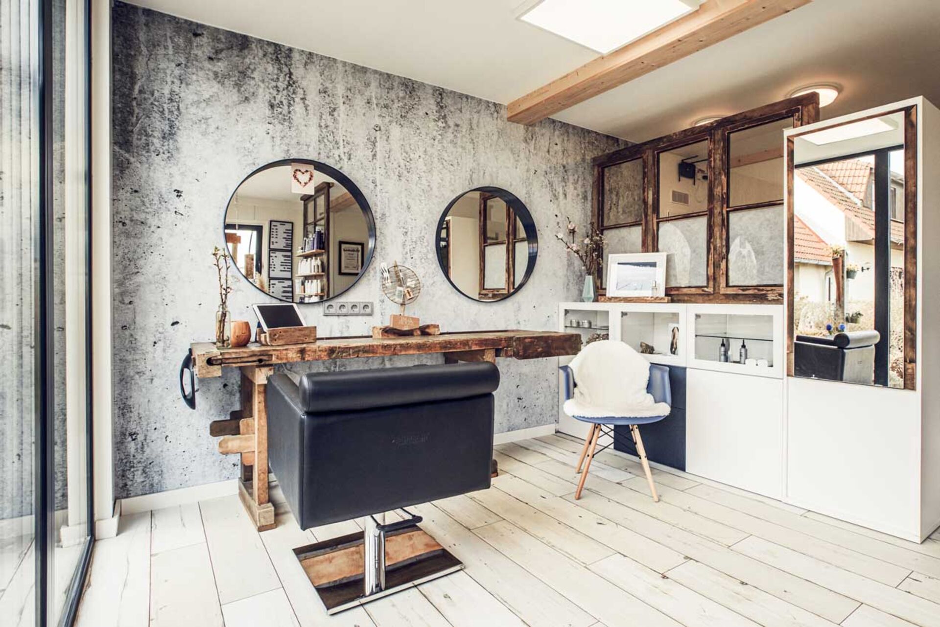 Dabei entstand ein besonderer, übersichtlicher Arbeitsraum, dem aber nichts an ästhetischem Design fehlt. Beim Interior wurden alte Elemente wiederverwendet, die bei der Wohnhaus-Sanierung weichen mussten. So sind alte Schuppenfenster oder -Türen nun Fixbestandteil der Salon-Inneneinrichtung. Auch eine alte Werkbank wurde zur Ablage für Kundinnen und Kunden umfunktioniert.