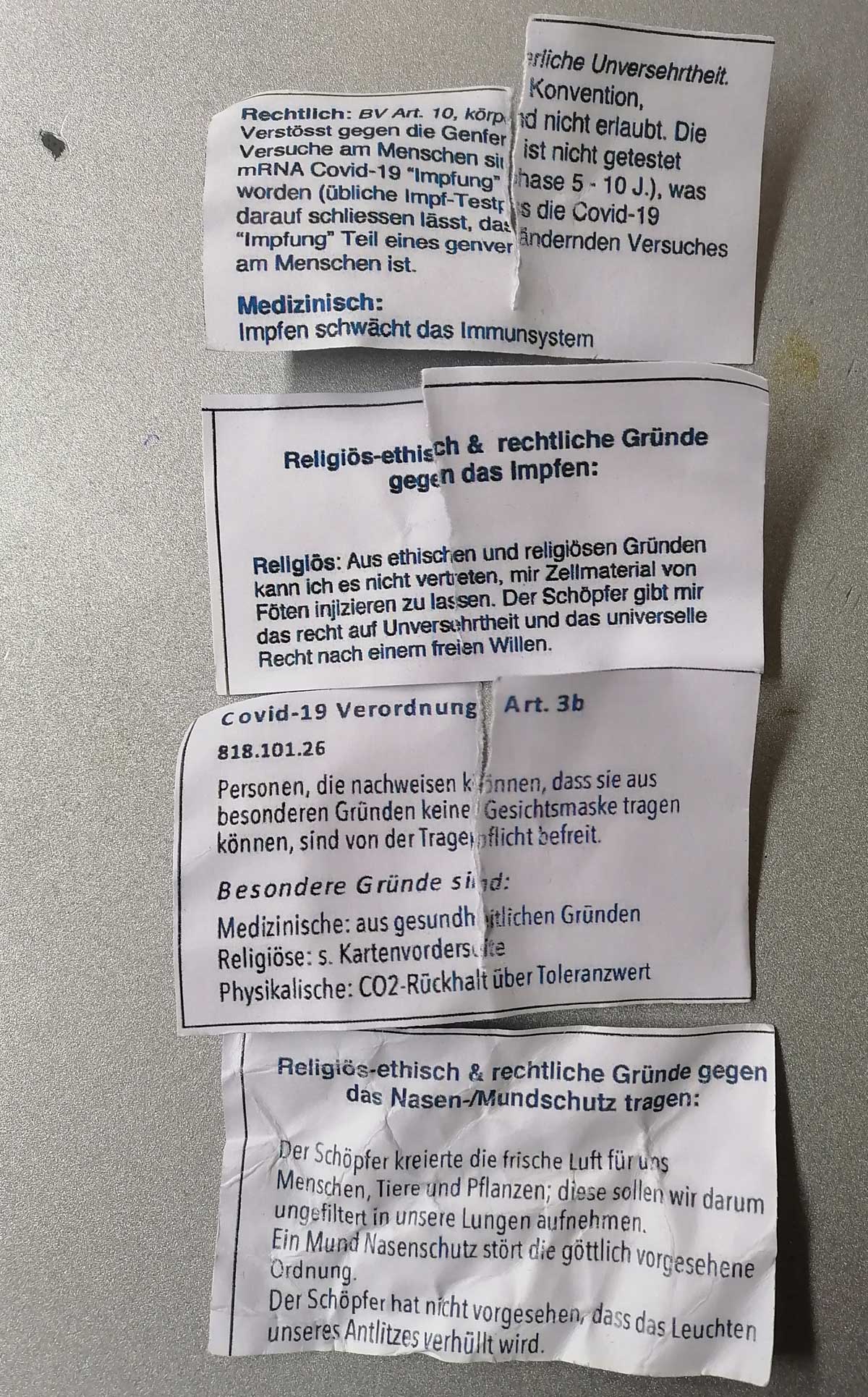 Neben den Aufklebern gibt es außerdem mehrere Zettel mit „Rechtauslegungen“ gegen das Impfen sowie Auszüge aus der Corona-Verordnung, die die Ausnahmen von der Maskenpflicht thematisieren.
