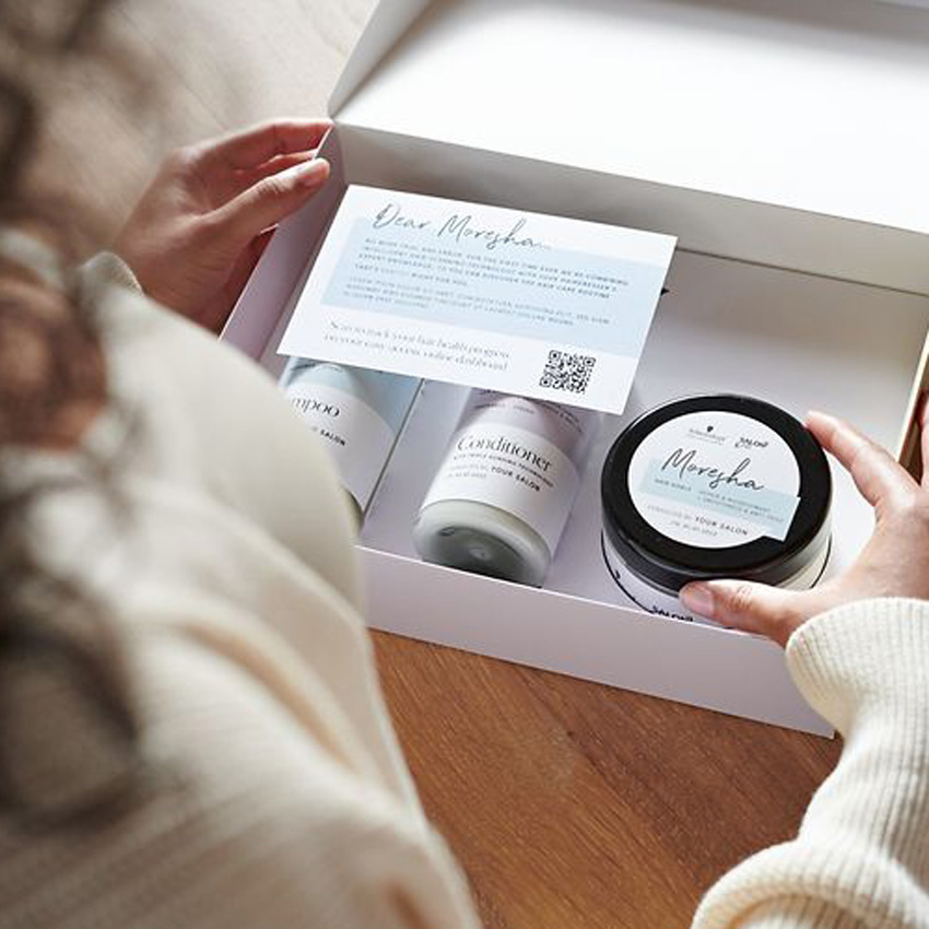 Komplexe Pflege, einfaches Konzept: nach einer Haaranalyse bei der Friseur*in können Kund*innen personalisierte SalonLab&Me Produktpakete mit Shampoo, Conditioner und Maske im salonexklusiven Onlineshop bestellen. Die in den Paketen enthaltenen Produkte wenden verschiedene Technologien an, darunter die innovative Triple-Bonding-Technologie.