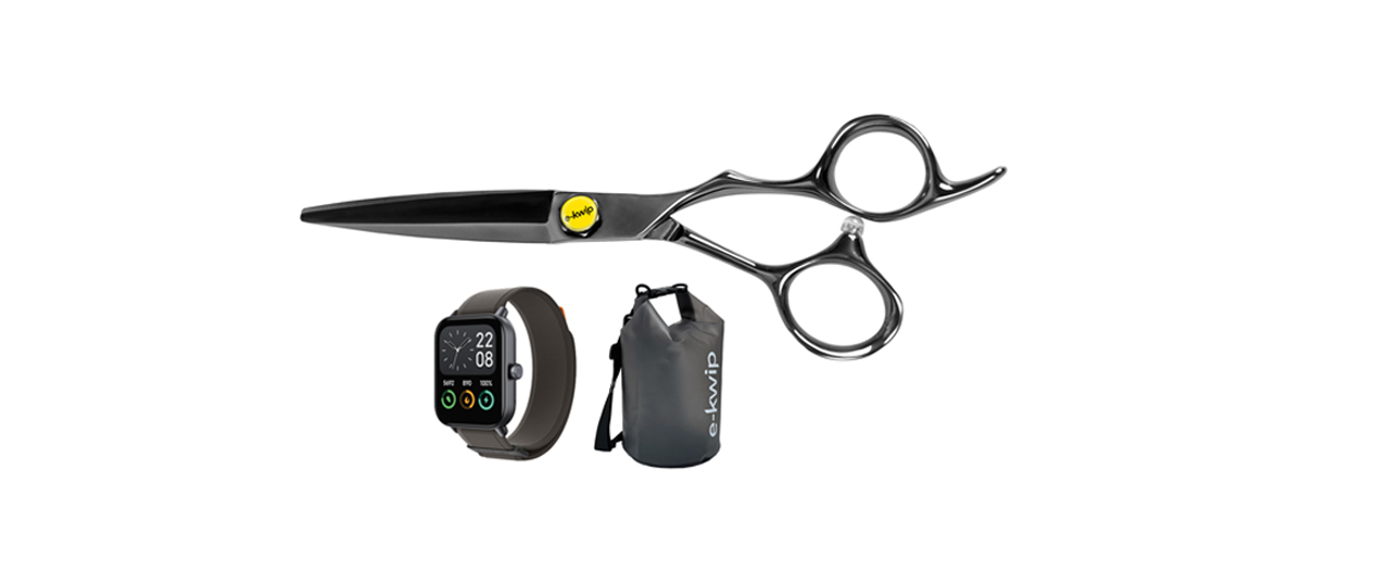 Je besser die Schere, desto schöner das Haar: Im neuen e-kwip Competition-Set aus dem Hause Haaro sind die e-kwip Schneideschere in 6.0”, eine Smartwatch und eine Dry bag enthalten.