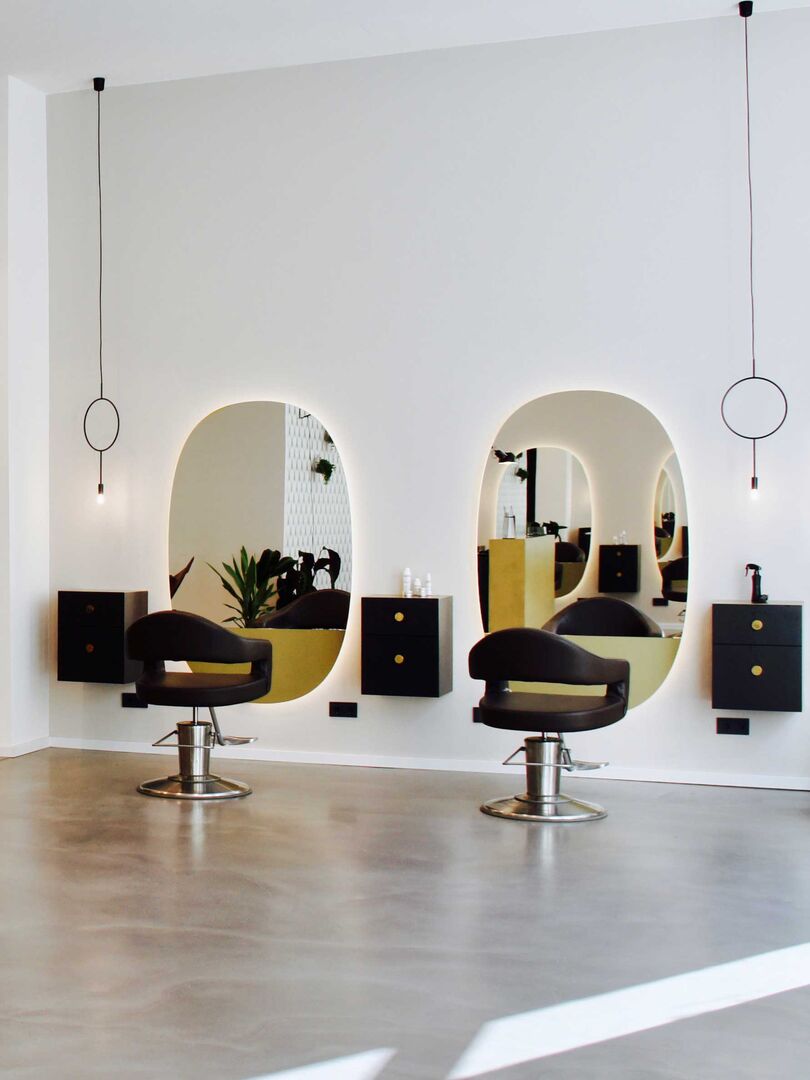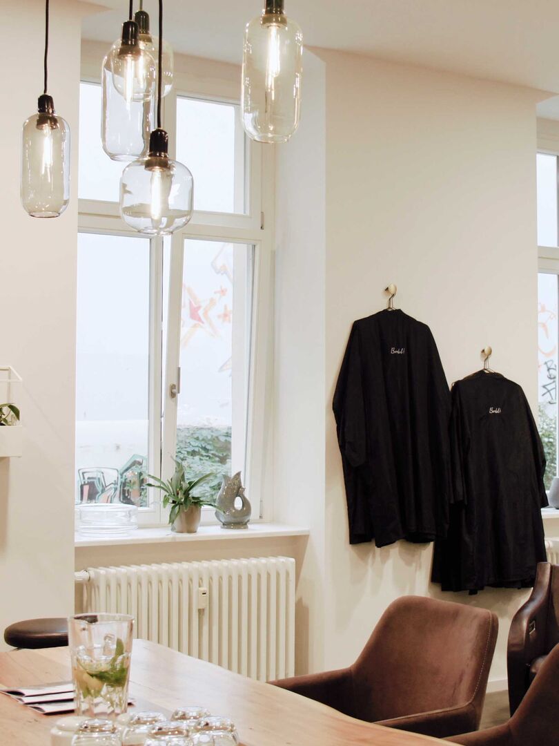 Japandi-Stil mitten in Berlin. Der neue Salon Bordel tritt mit schlichtem reduziertem aber trotzdem warmen, einladenden Interieur auf. Die schwarzen Elemente und organische Formen, die in Salon-Stühlen, Lampenformen, großen Vasen und ovalen Spiegeln zu finden sind, repräsentieren den Japan-Elemente.