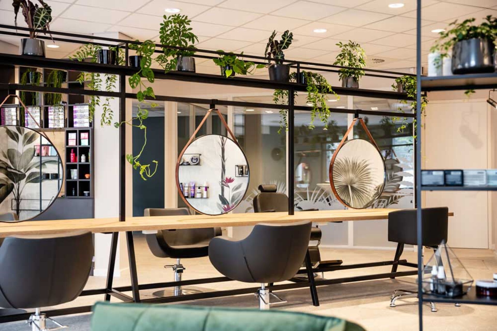 Dieses Design spricht für sich: saftig-grüne Pflanzen, die von dem schwarzen Spiegel-Stahlgerüst herunterwachsen und Tapeten, die mit aufgemalten Urwaldpflanzen bestückt sind – das nennt man Dschungelfieber im niederländischen Salon Tease. Die Mischung aus braunen Eichenholzelementen und schwarz lackiertem Stahl bringen die gewollten rustikalen Vibes in den Raum. Ein paar dunkle Ledersessel, die vielen Pflanzen und eine braune Mosaikwand im Haarwaschbereich, sorgen für ein ebenfalls rustikales, aber naturverbundenes Design. Exotisch wird es mit der Tapete – Palmen und Blumen sind zu sehen, die das Urwaldfeeling umso mehr in den Salon bringen. Urlaub im Dschungel während eines Friseurbesuchs, na das klingt doch nach Entspannung!