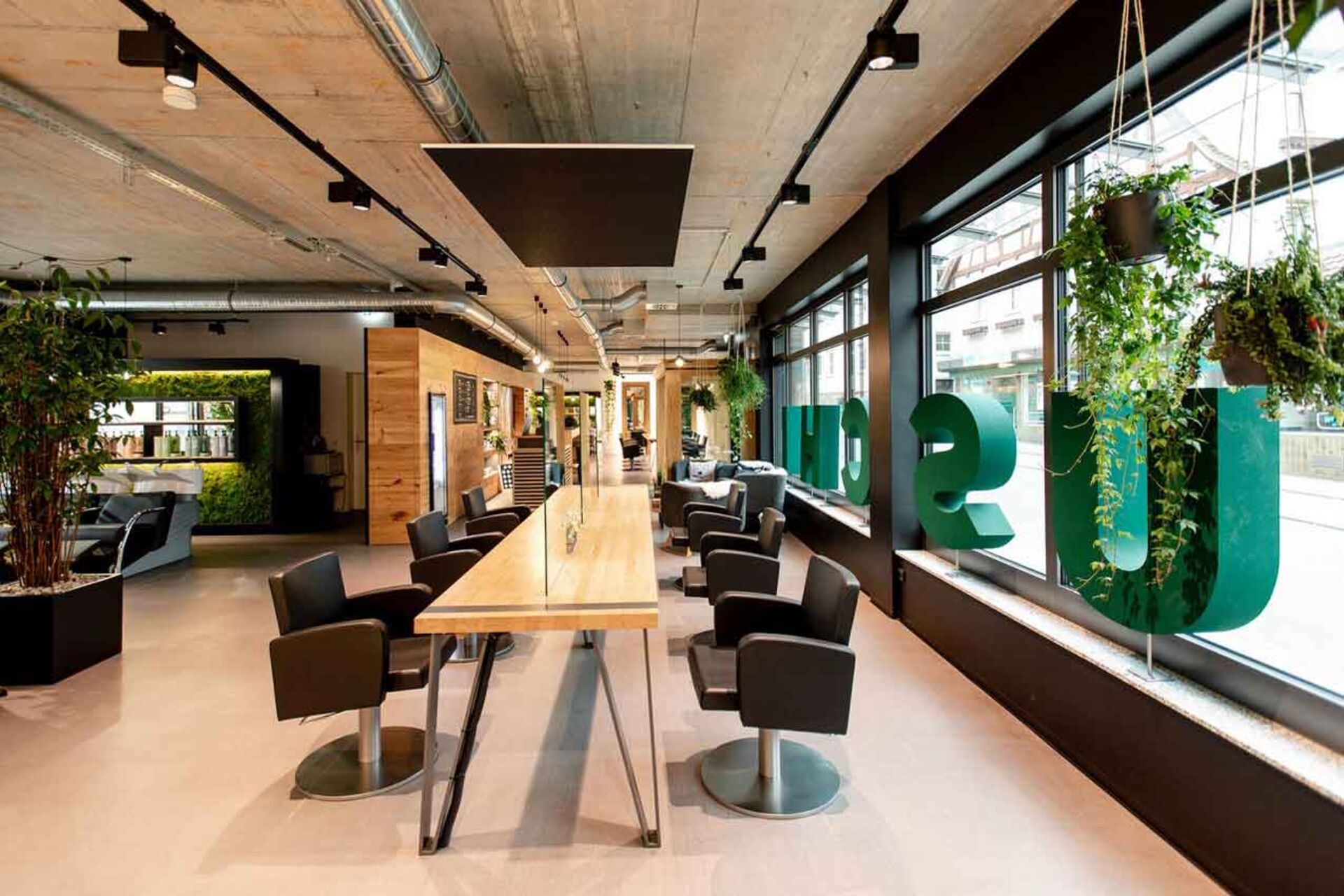 Das Mobiliar hergestellt aus natürlichen Materialien, wie z.B. aus Beton, Stahl und Holz zieren die Wände, Decken und Böden des Salons. Große Holzkästen, gefüllt mit veganen Haar-Produkten von Maria Nila und O&M, lange Frisiertische, die sich längst durch den Salon erstrecken und darüber Stahlrohre, die die Decke schmücken. Selbst die Stuhlüberzüge sind vegan.