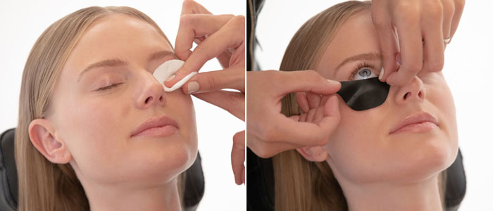 Den Augenbereich mit RefectoCil Augen Make up Entferner und Kochsalzlösung reinigen und die unteren Wimpern mit den RefectoCil Silicone Pads abdecken – denn nur die oberen Wimpern werden geliftet!