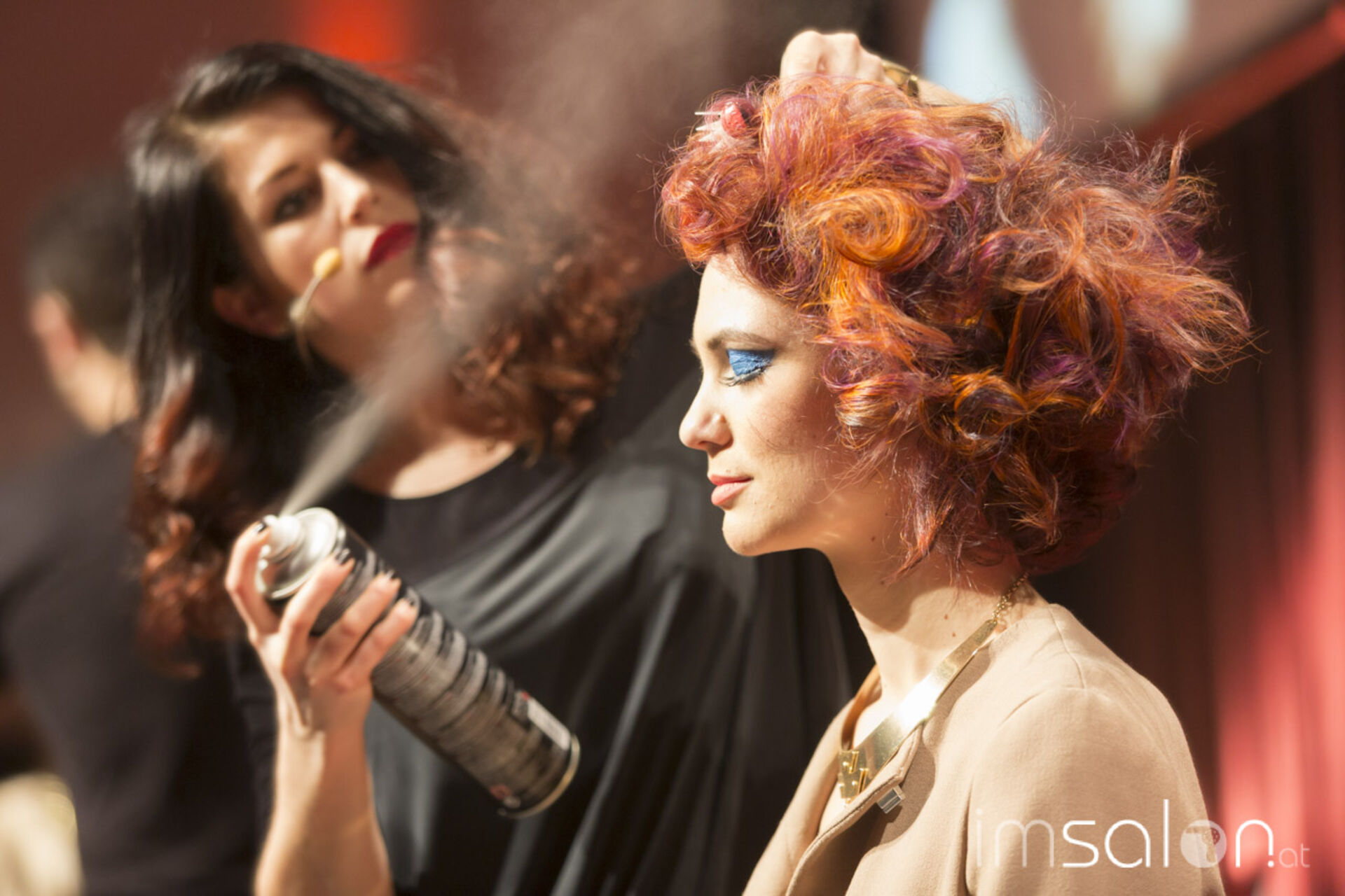 Klassische Handwerkskunst und friseureigene Fertigkeiten gehören eingesetzt: Glätt- und Lockeneisen, klassisch gelegte Welle mit geglätteten Längen unterlegt mit warmen und kühlen Farbkombinationen.