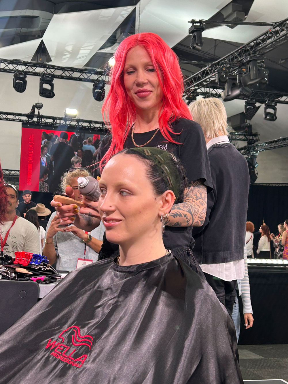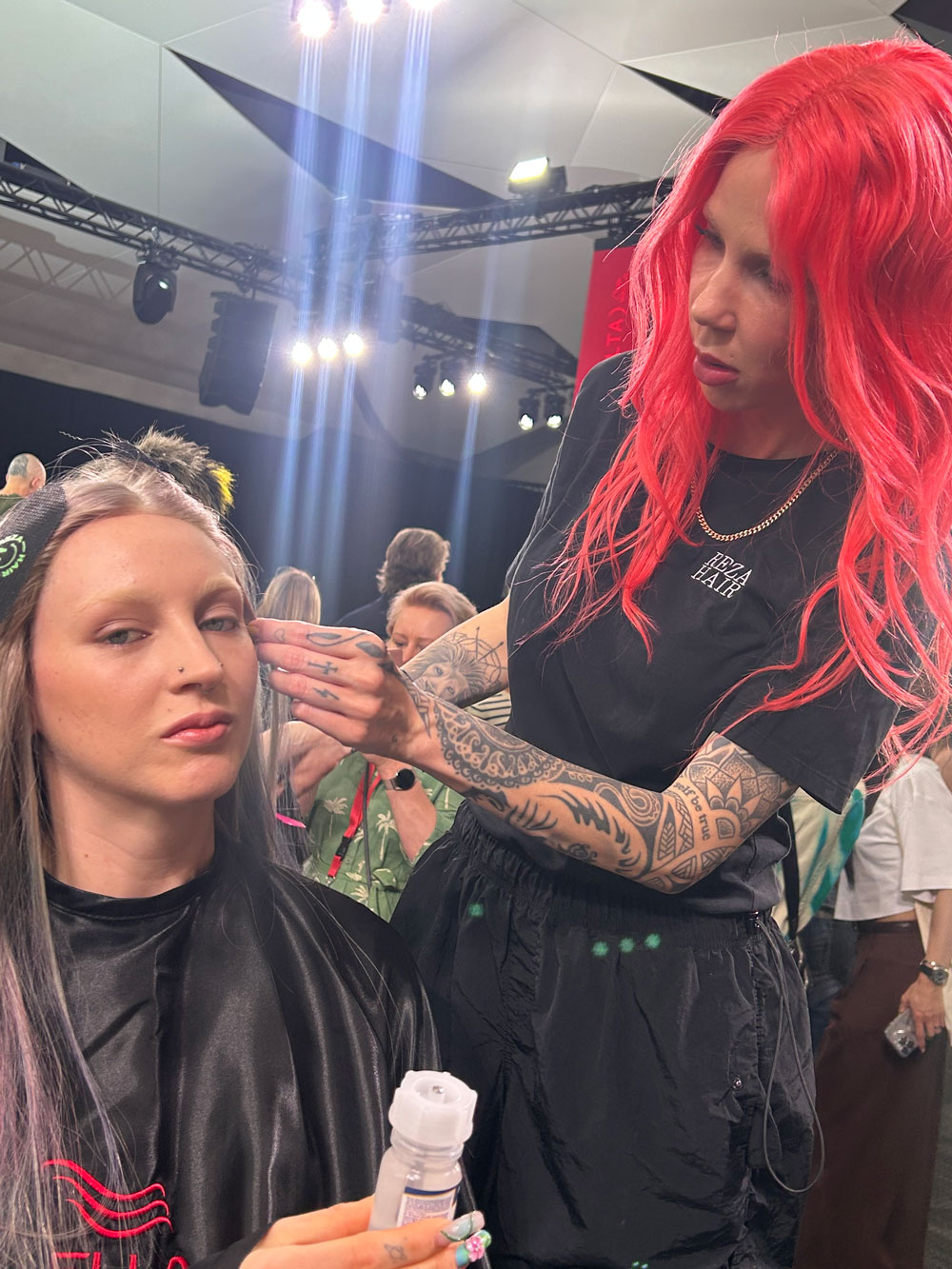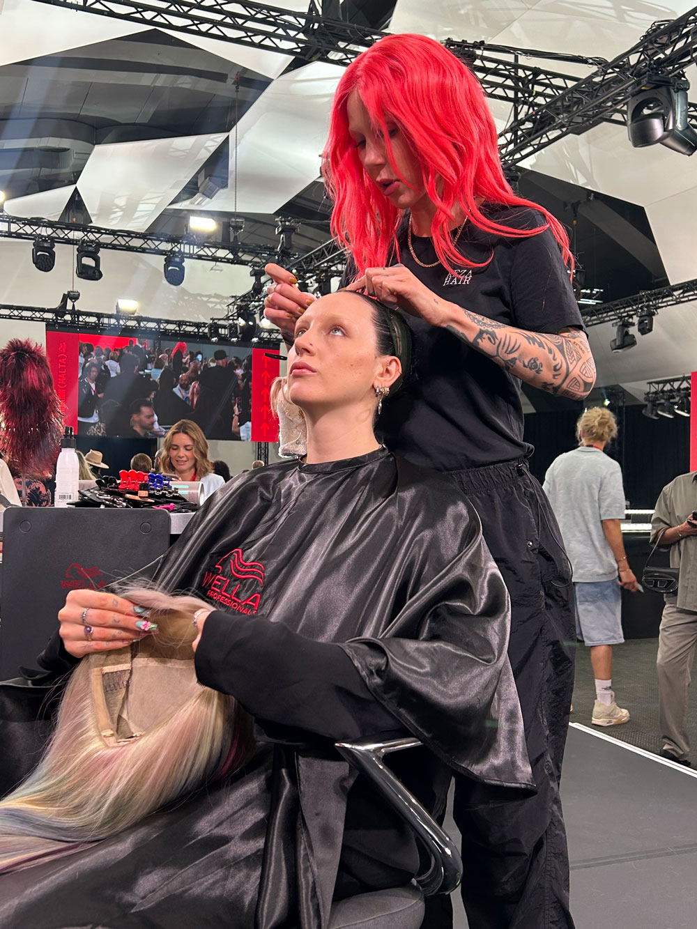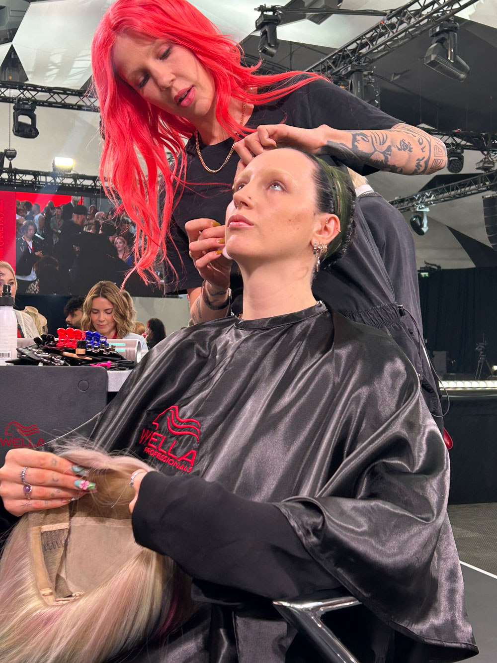 In meinem Friseursalon in Berlin-Mitte habe ich vor ein paar Jahren mit meinem lieben Kollegen Nik in der 2. Etage ein Perückenatelier eröffnet. Wir sind darauf spezialisiert, Perücken zu färben und zu schneiden, also zu personalisieren. Im Prinzip setzen wir wie bei einem Friseurtermin die gewünschte Dienstleistung für unsere Kunden auf ihrer Perücke um. Wir heben uns damit ab und ergänzen klassische Perückenstudios. Es ist wie eine kleine Brücke zwischen Perückenstudio und Friseursalon. Auf der Bühne werden wir showcasen, wie wir Perücken färben und was wir damit alles machen können, ob für Fotoshootings, Musikvideos oder auch für die ganz normale Kundin im Alltag.
